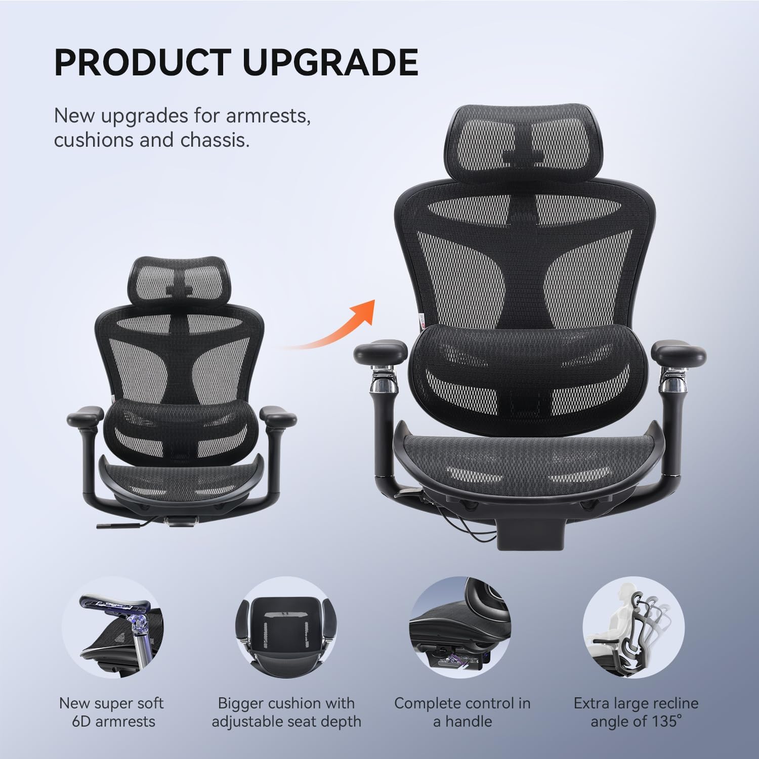 Le soutien lombaire suit automatiquement les mouvements corporels pour un confort continu. Les accoudoirs 5D (5 directions de réglage) se synchronisent en inclinaison pour un repositionnement optimal des bras.