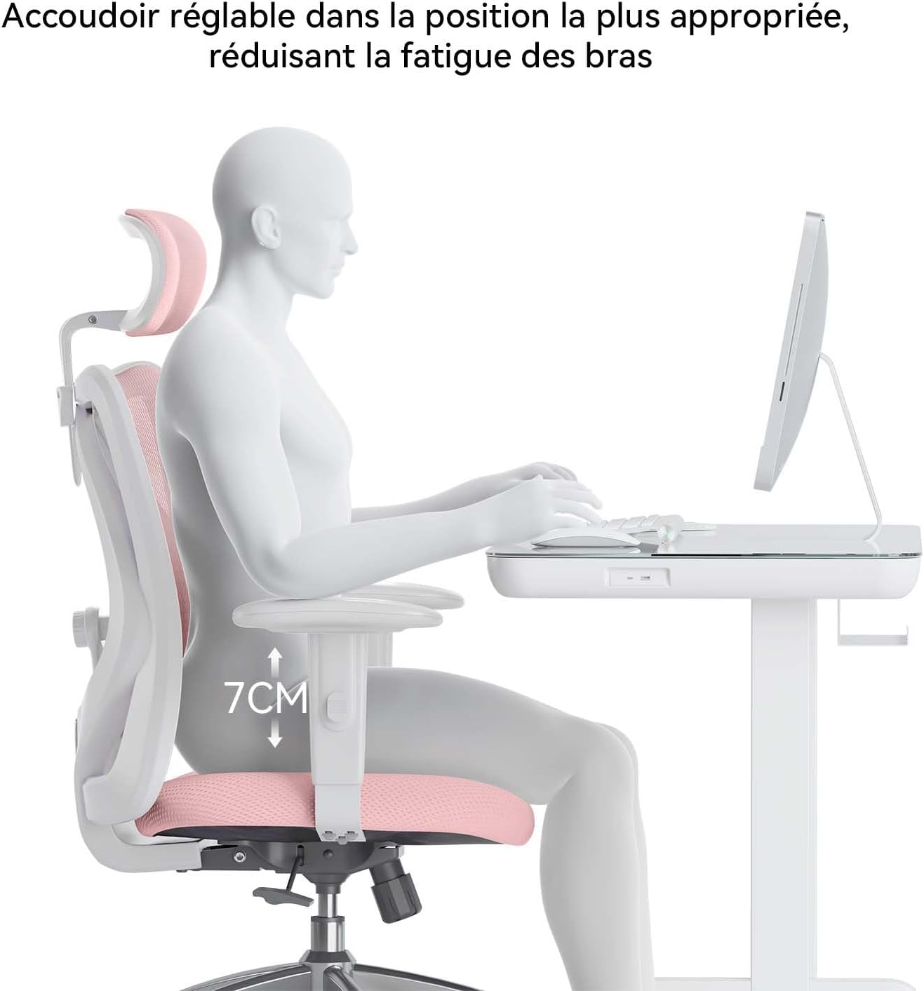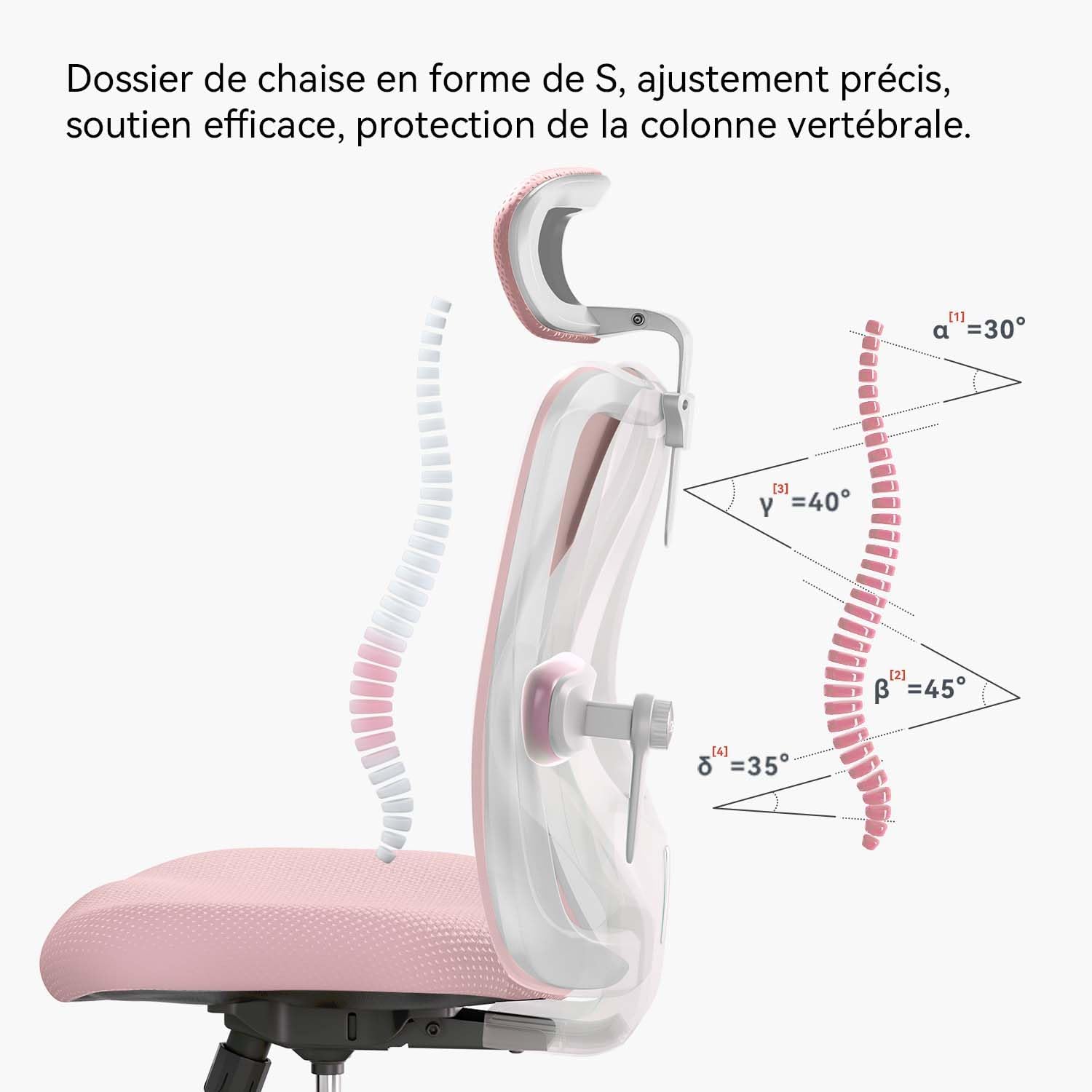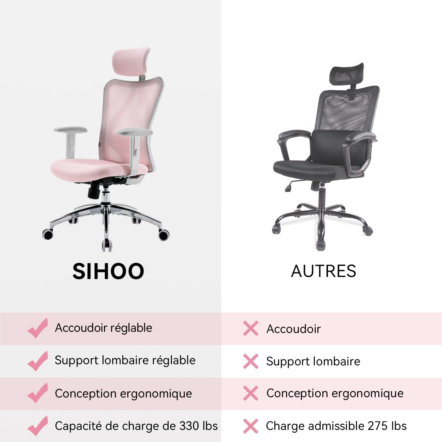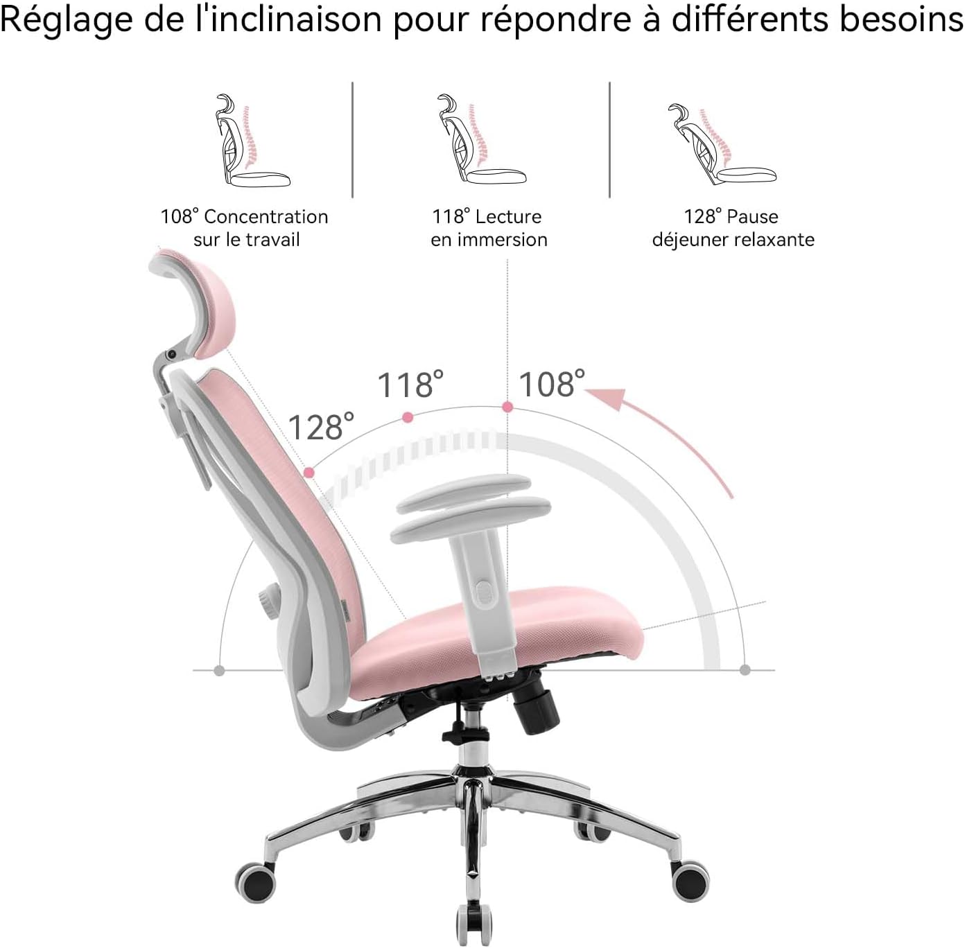 | Libellé | SIHOO M18 Chaise ergonomique - Soutien 4 points (tête/dos/lombaire/mains) - Maille respirante - Appui-tête & lombaire réglables - Pour 1,68-1,88m - 150kg max - Certifié BIFMA - Bureau/maison/jeux - Rose |