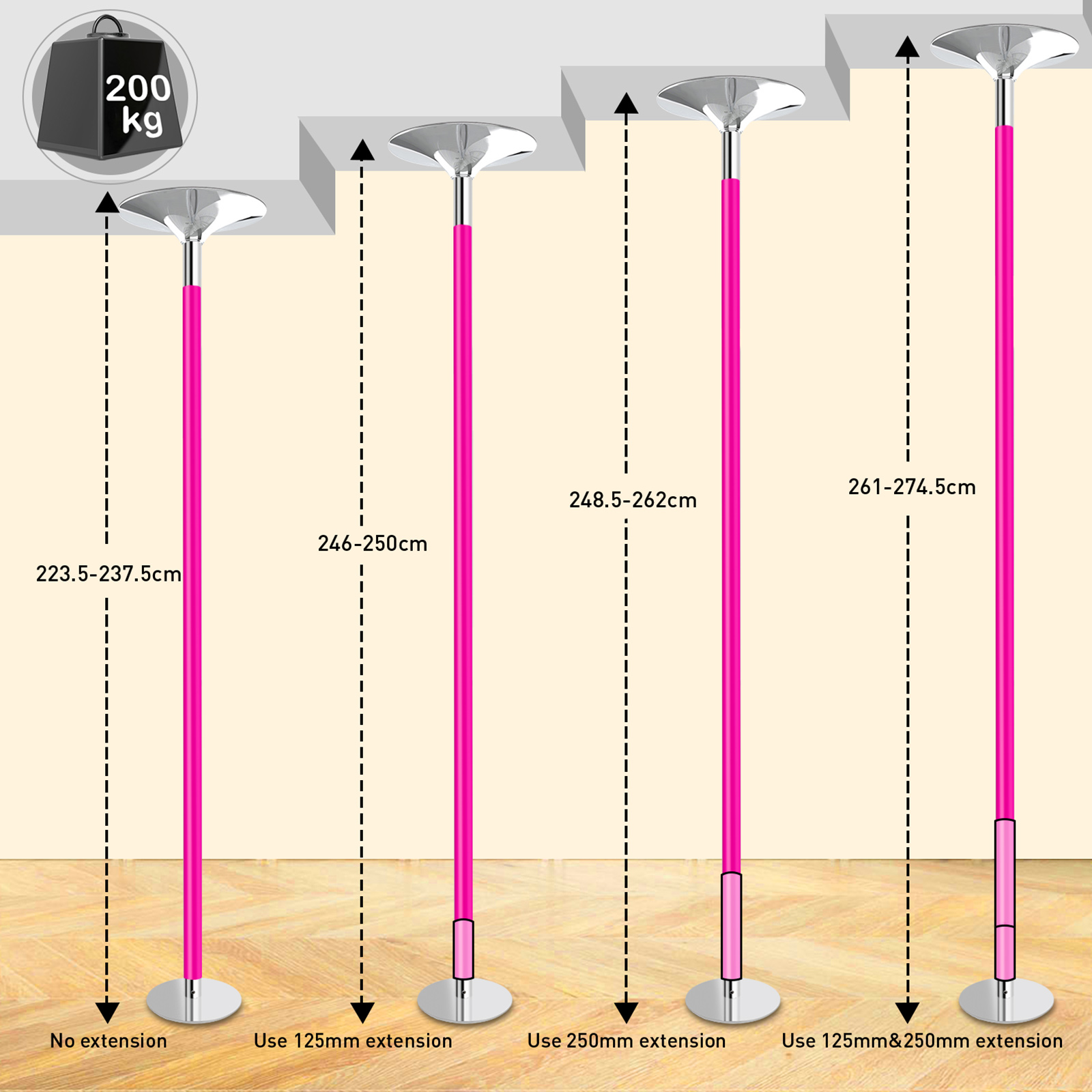 | Libellé | Silicone Barre Pôle de Danse, Hauteur Réglable 223,5-274,5cm, Statique et Rotative, Charge maximale 200 Kg, pour Danse Exercise Fitness |