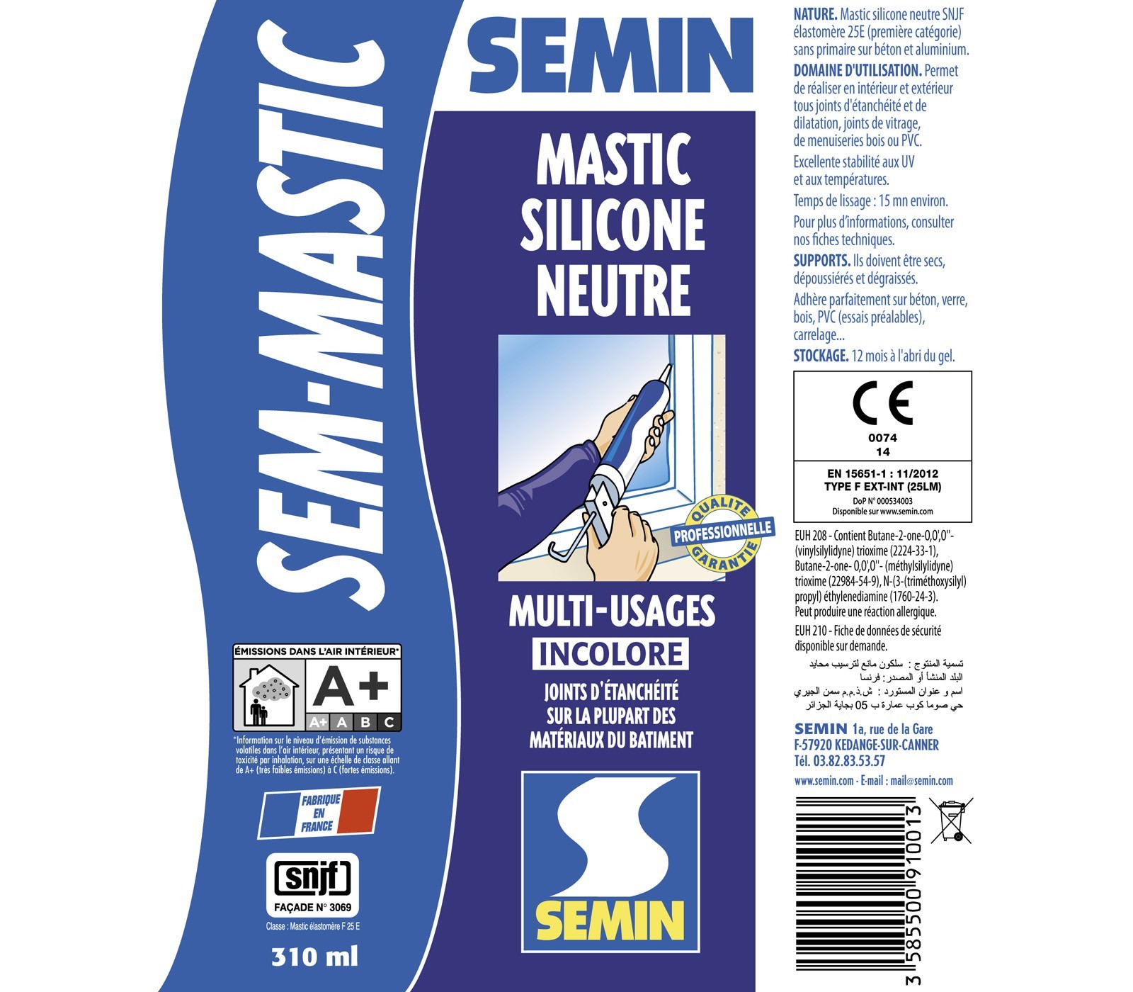 | Libellé | Silicone neutre PVC incolore multi usages Semin - intérieur/extérieur - cartouche de 310 ml |
