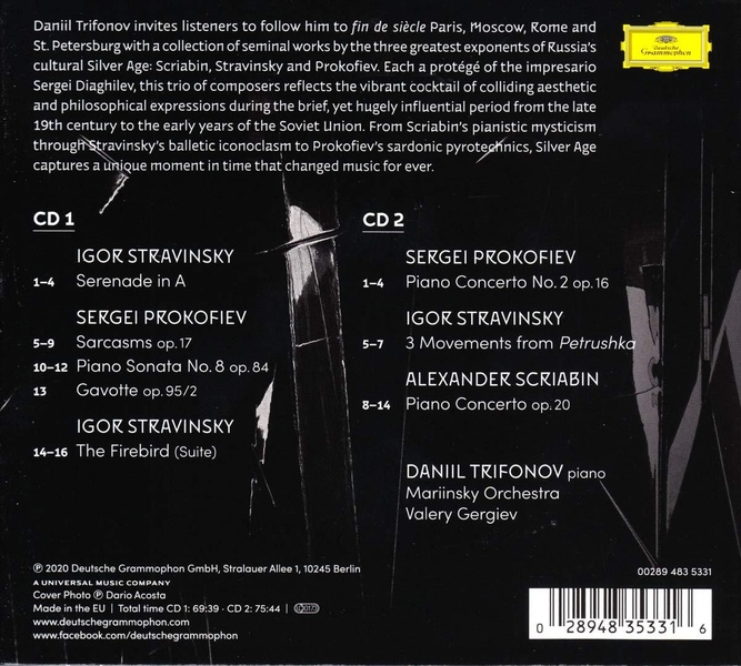 Le nouvel album, Silver Age de Daniil Trifonov, enregistré avec Valery Gergiev et l'orchestre Mariinsky, rappelle une époque où les compositeurs, poètes, artistes, dramaturges et vedettes russes comptaient parmi les plus originaux. Il illustre l'audace et l'éclat artistique d'une époque charnière de l'histoire du pays avec des oeuvres de trois de ses compositeurs les plus importants : le Concerto pour piano et orchestre en fa dièse mineur op.20 de Scriabine, le Concerto pour piano n°2 en sol mineur op.16 de Prokofiev et les Trois mouvements de Pétrouchka de Stravinsky. La liste des morceaux comprend également la Sérénade de Stravinsky et des extraits de la version pour piano de l'Oiseau de feu du compositeur, ainsi que les Sarcasmes op.17 de Prokofiev, la Sonate pour piano n° 8 en si bémol majeur op.84 et la \"Gavotte\" de Cendrillon op.95 n° 2. Le choix musical de Daniil Trifonov reflète la variété inventive de ce moment culturel bref mais explosif.