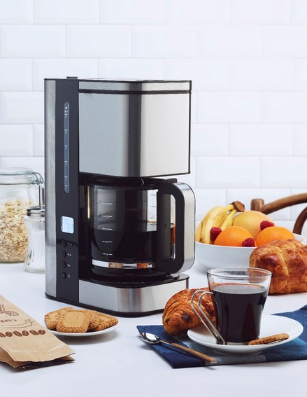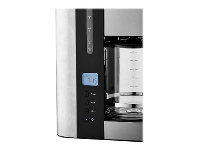 La cafetière à filtre programmable permet de préparer jusqu'à 1,5 L de café moulu - soit 12 tasses - en une seule fois ! Ingénieuse, elle est programmable jusqu'à 24h en avance, pratique pour prendre votre café chaud à la sortie du lit ou rester à table pendant que le café se prépare tout seul pour vos invités ! Son écran LCD permet aussi de régler la fonction maintien au chaud pour déguster votre boisson à votre convenance. L'arrêt automatique s'effectue au bout de 30 minutes pour économiser de l'énergie. Confortable d'utilisation, on peut voir son niveau d'eau grâce à la fenêtre graduée et la fonction stop goutte permet de retirer la verseuse avant la fin du cycle. En acier inoxydable brossé avec finition noire mat, la cafetière est design et compacte pour s'intégrer parfaitement dans votre cuisine.