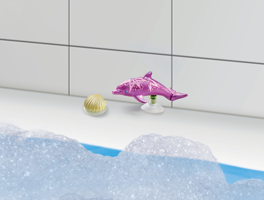 Bienvenue dans le monde coloré des sirènes ! Comprend un personnage, deux dauphins dont un qui possède un socle ventouse pouvant se fixer au rebord de votre baignoire ainsi que des coquillages ayant ce même socle.