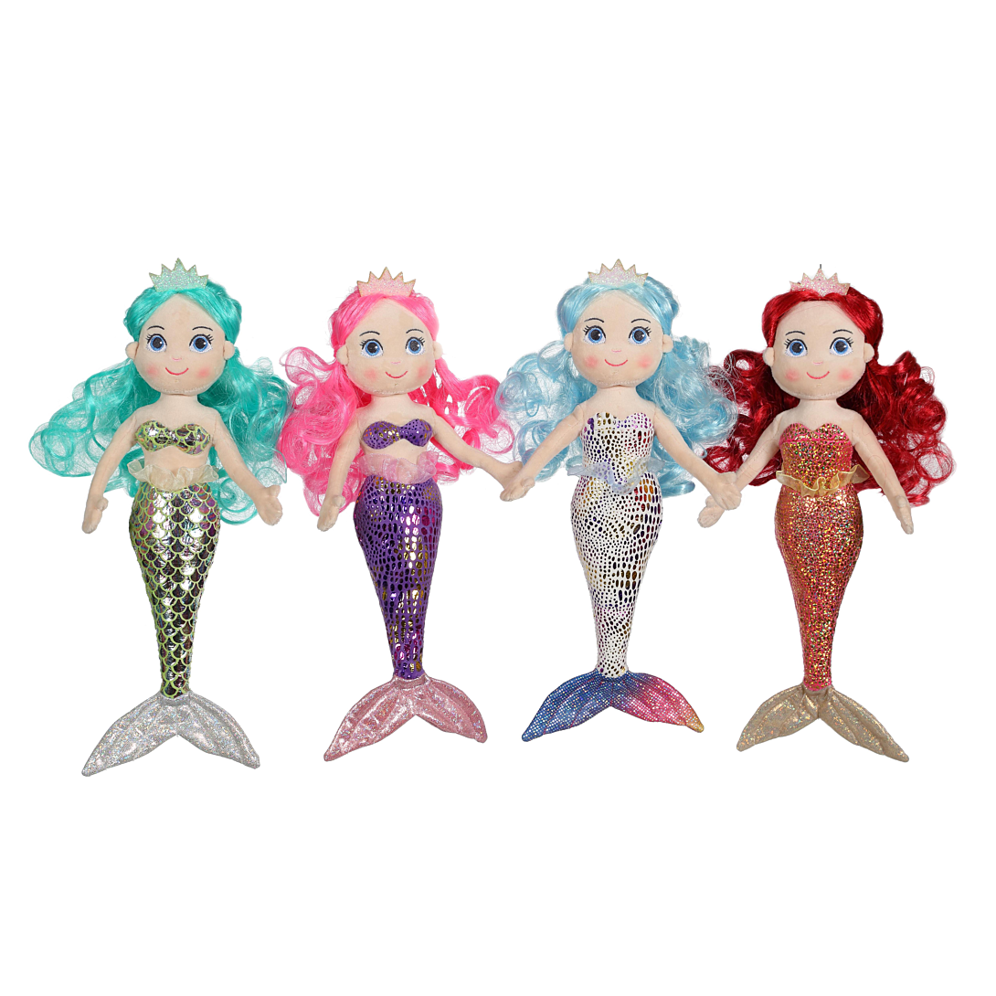 Plongez dans de nouvelles aventures avec la jolie sirène en peluche aux longs cheveux . Cette sirène toute douce de 30 cm au corps pailleté et à la queue dorée qui enchantera tous les petits rêveurs !