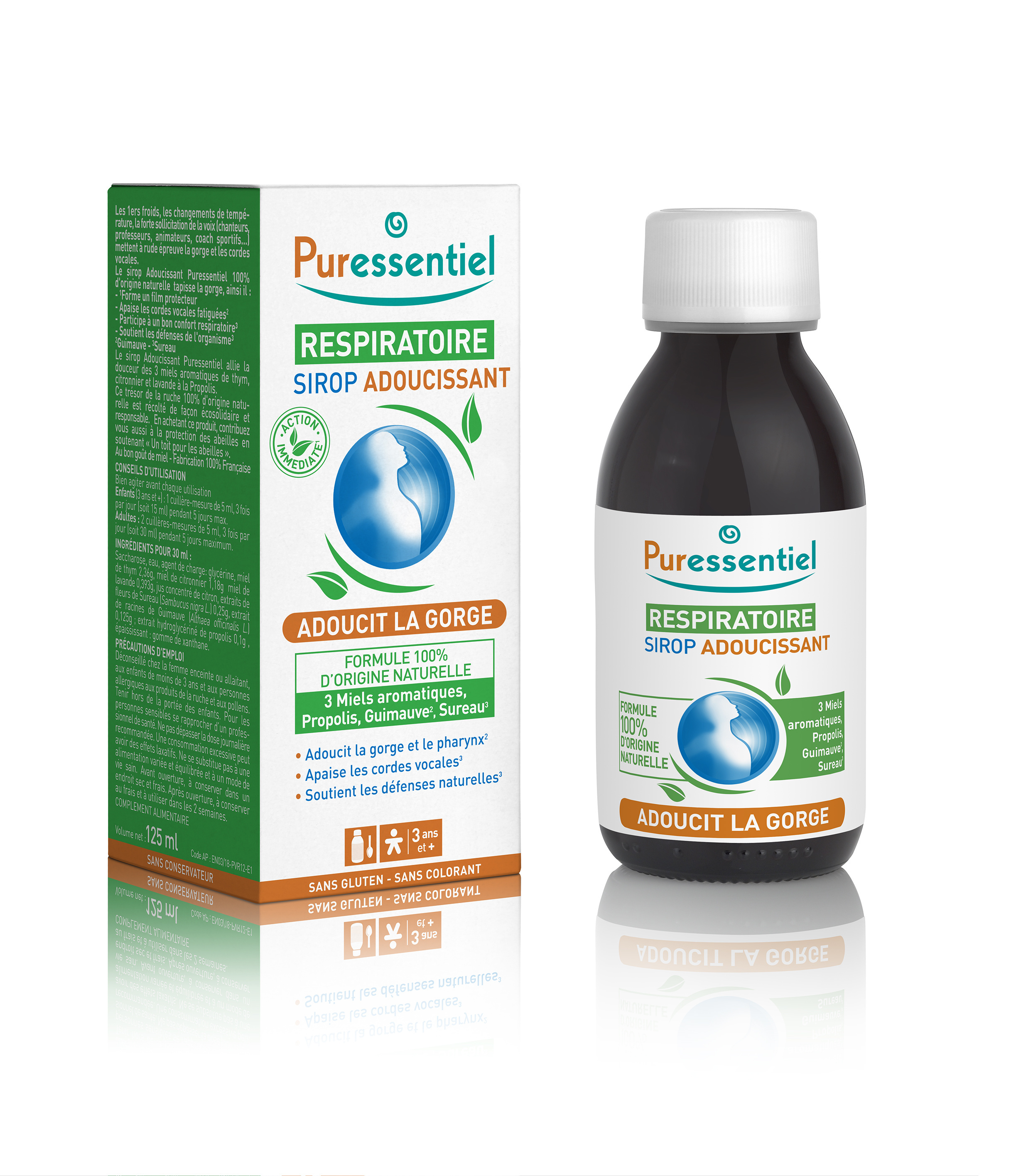 Les 1ers froids, les changements de température, la forte sollicitation de la voix (chanteurs, professeurs, animateurs, coach sportifs...) mettent à rude épreuve la gorge et les cordes vocales. Le sirop Adoucissant Puressentiel 100% d'origine naturelle tapisse la gorge, ainsi il : - (1)Forme un film protecteur - Apaise les cordes vocales fatiguées(2) - Participe à un bon confort respiratoire - Soutient les défenses de l'organisme (3) (2)Guimauve - (3)Sureau Le sirop Adoucissant Puressentiel allie la douceur des 3 miels aromatiques de thym, citronnier et lavande à la Propolis. Ce trésor de la ruche 100% d'origine naturelle est récolté de façon écosolidaire et responsable. En achetant ce produit, contribuez vous aussi à la protection des abeilles en soutenant le réseau d'apiculteurs "Un toit pour les abeilles". Au bon goût de miel - Fabrication 100% Française.