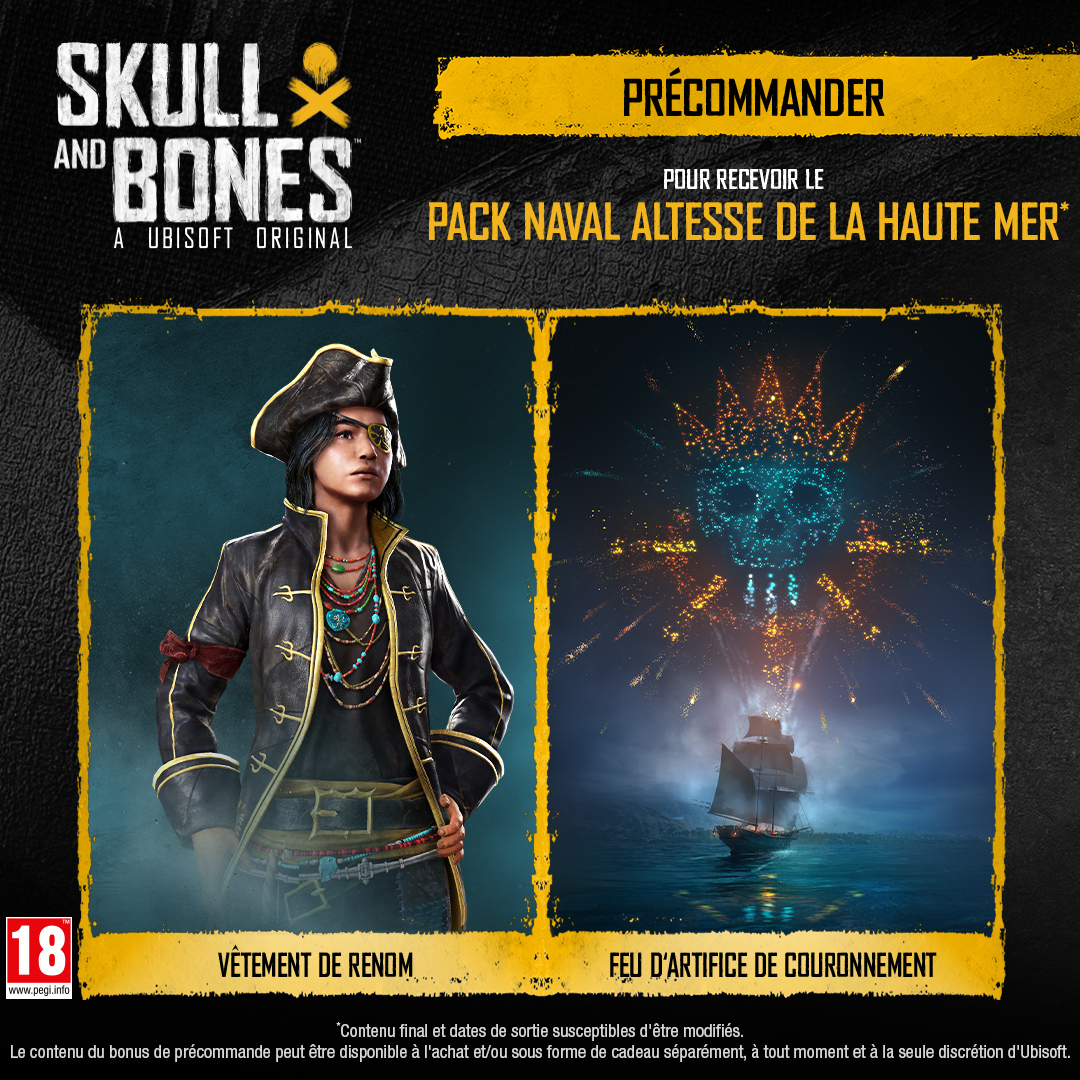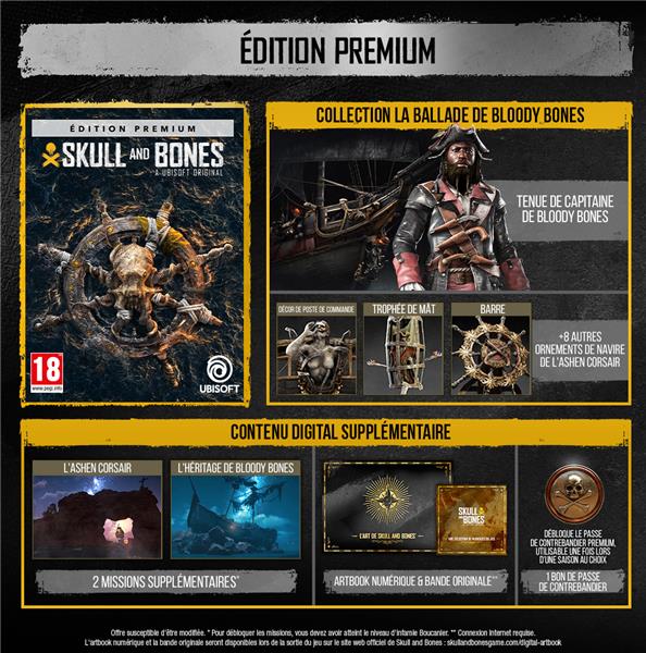 Contenu bonus : L'édition Premium inclut : - La collection « La ballade de Bloody Bones », avec une tenue de capitaine et des ornements de navire. - Deux missions supplémentaires : L'Ashen Corsair et L'héritage de Bloody Bones. - Le bon de passe de contrebandier, qui permet de débloquer le Battle Pass Premium et du contenu supplémentaire. Plus-Produit : Le livre d'art numérique et une sélection de la bande originale du jeu. L'édition Premium inclut : - La collection « La ballade de Bloody Bones », avec une tenue de capitaine et des ornements de navire. - Deux missions supplémentaires : L'Ashen Corsair et L'héritage de Bloody Bones.** - Le bon de passe de contrebandier, qui permet de débloquer le Battle Pass Premium et du contenu supplémentaire. - Le livre d'art numérique et une sélection de la bande originale du jeu.*** Plongez dans le dangereux monde des pirates de Skull and Bones, un RPG d'action coopératif en monde ouvert, et devenez le capitaine pirate le plus redouté des mers !