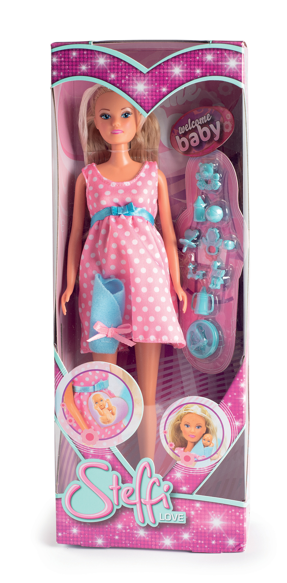 | La boîte contient | 1 Poupée mannequin Steffi Enceinte (bébé intégré) + 10 accessoires |