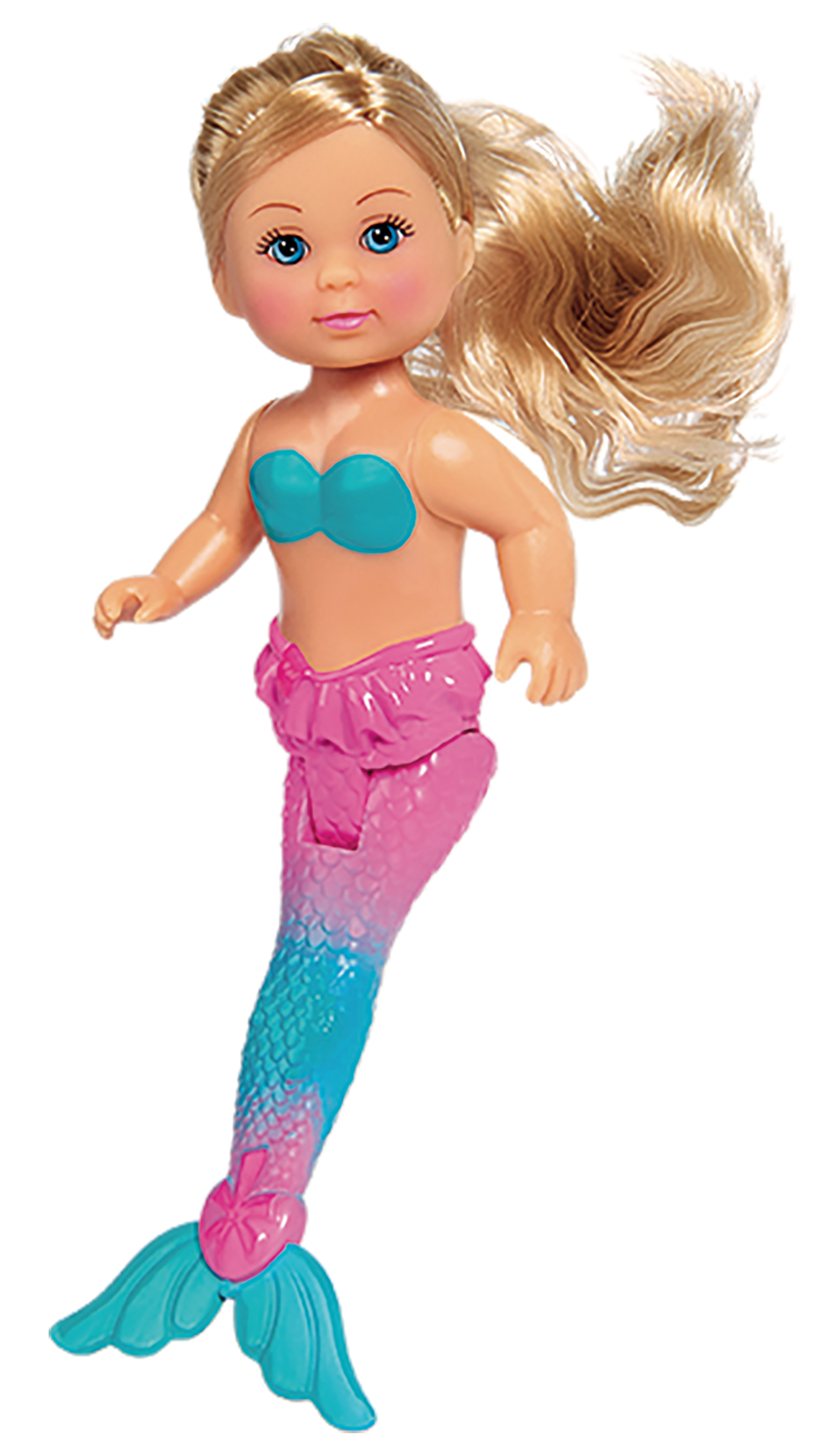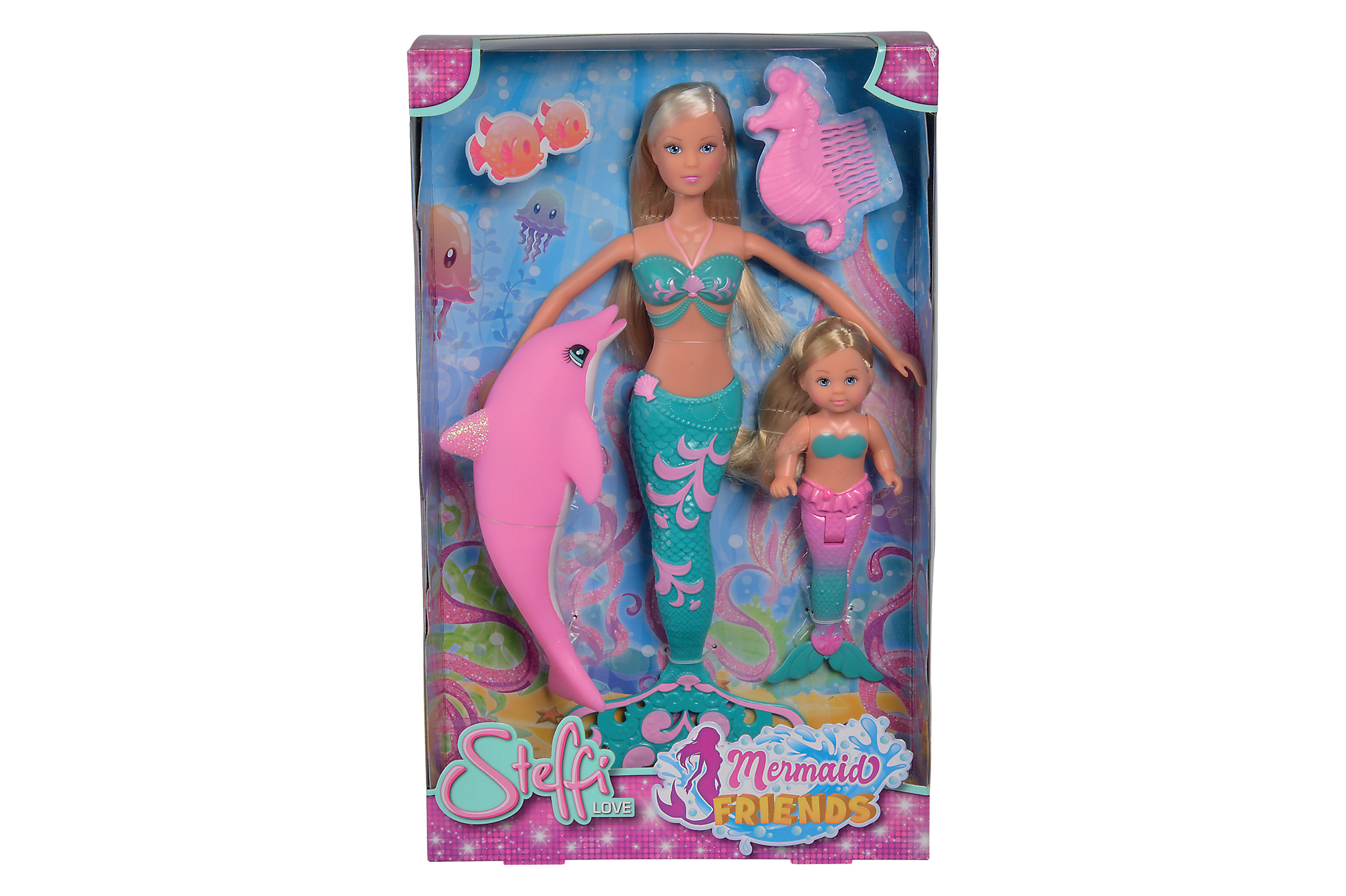 Poupées mannequins Steffi (29cm) et Evi (12cm) en tenue de sirène, avec un dauphin. Evi peut tenir assise en pliant sa nageoire caudale. 1 peigne en forme d'hippocampe est inclus. A partir de 3 ans.