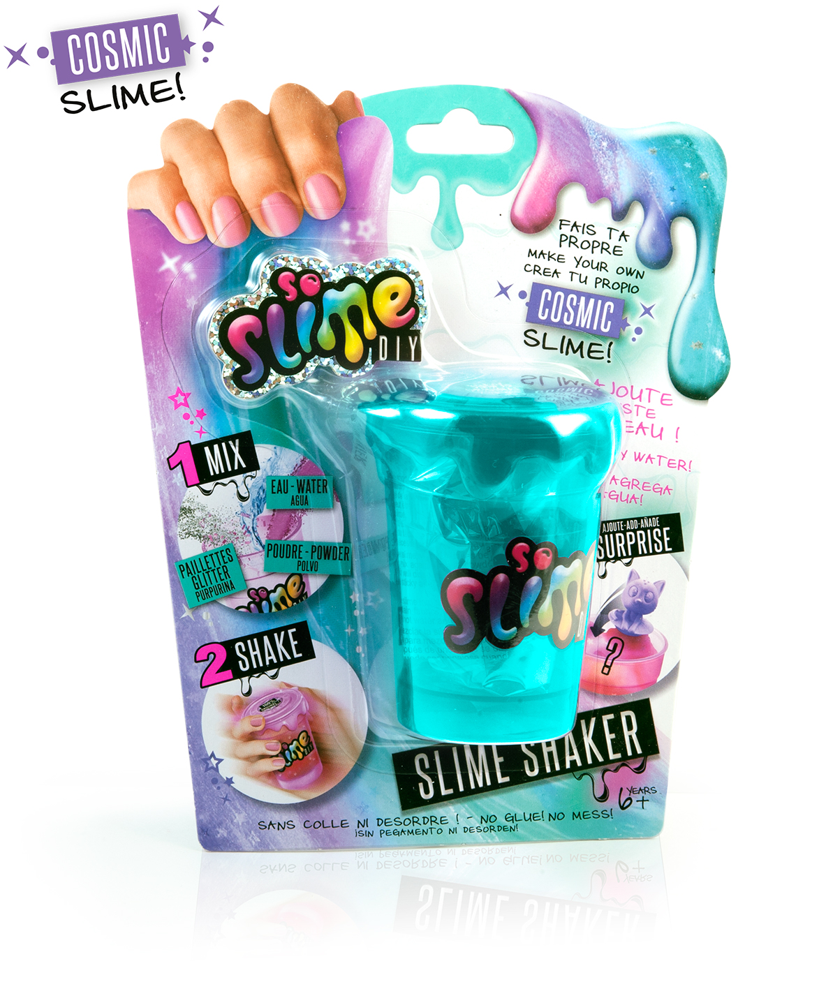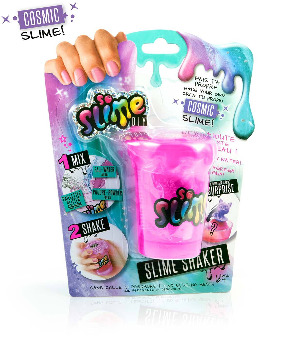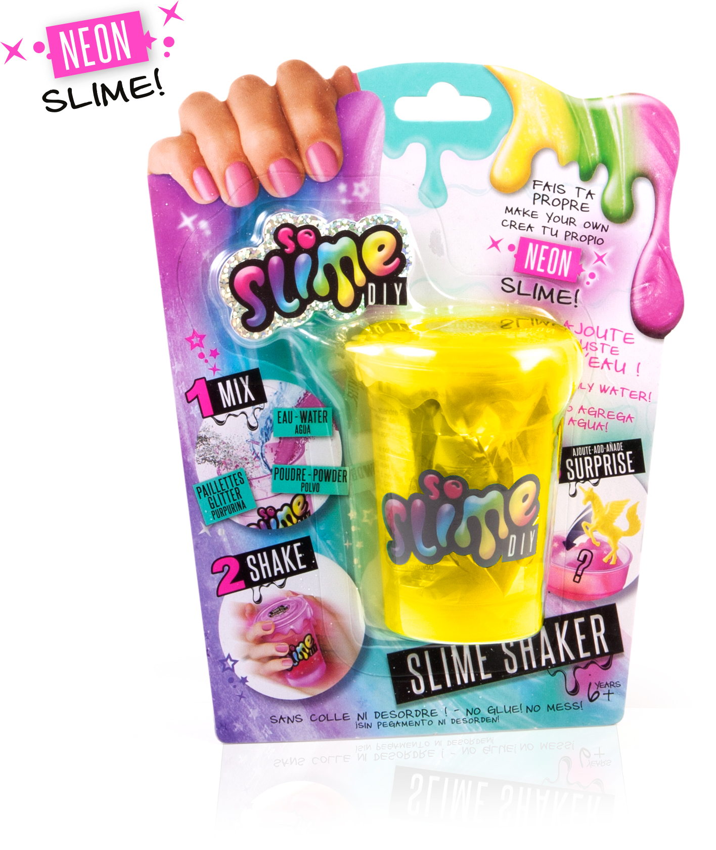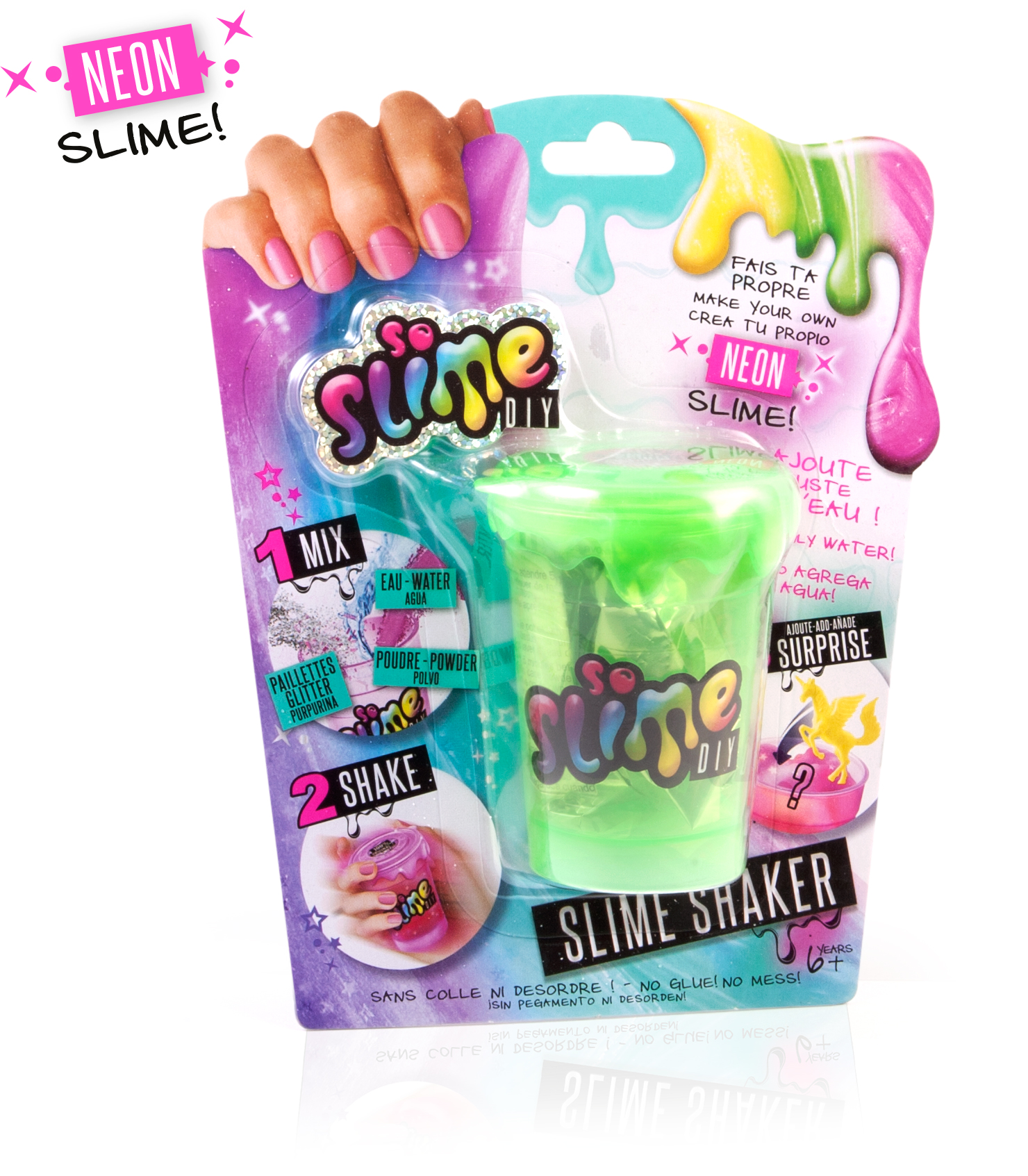Crée ta slime en mélangeant ta poudre à de l'eau puis ajoute des paillettes ou des confettis ! Super une mini figurine surprise à l'intérieur !