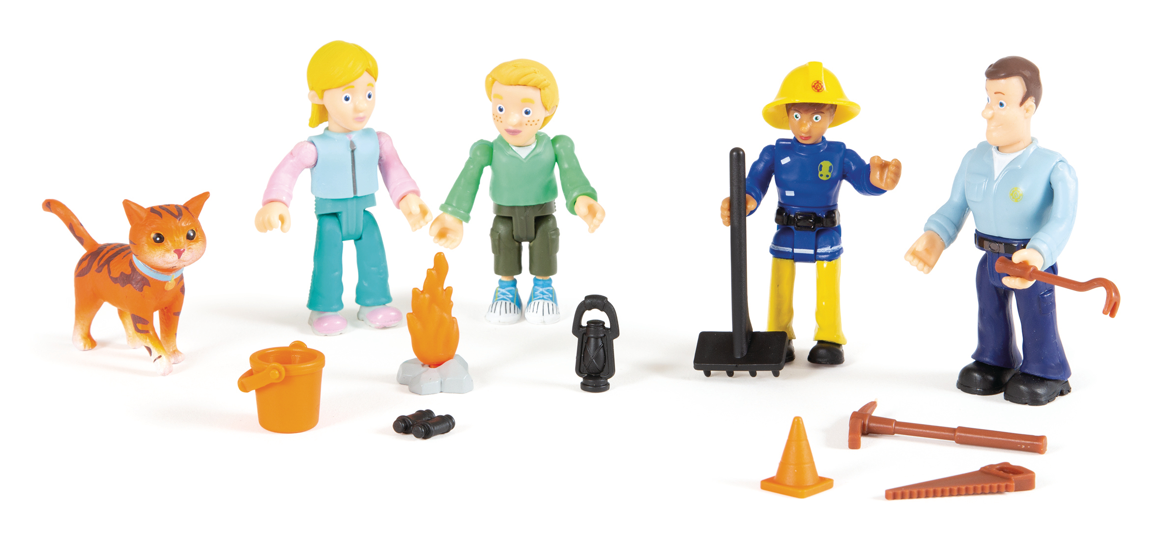 Coffret Sam le Pompier composé de 5 figurines (Sarah, Mathieu, Ellie, Sam et Lion, le chat de Béatrice), et de 3 set d'outils : 1 set noir, 1 set orange, 1 set marron.