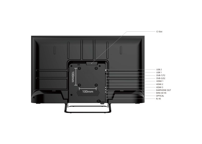 Smart-Tech 32HV02V. Taille de l'écran: 81,3 cm (32"), Résolution de l'écran: 1366 x 768 pixels, Type HD: HD, Technologie d'affichage: DLED, Forme d'écran: Plat. Smart TV. Luminosité de l'écran: 180 cd/m², Temps de réponse: 8,5 ms, Taux de contraste: 3000:1, Format d'image: 16:9. Format du système de signal numérique: DVB-C, DVB-S2, DVB-T2. Wifi, Ethernet/LAN. Couleur du produit: Noir