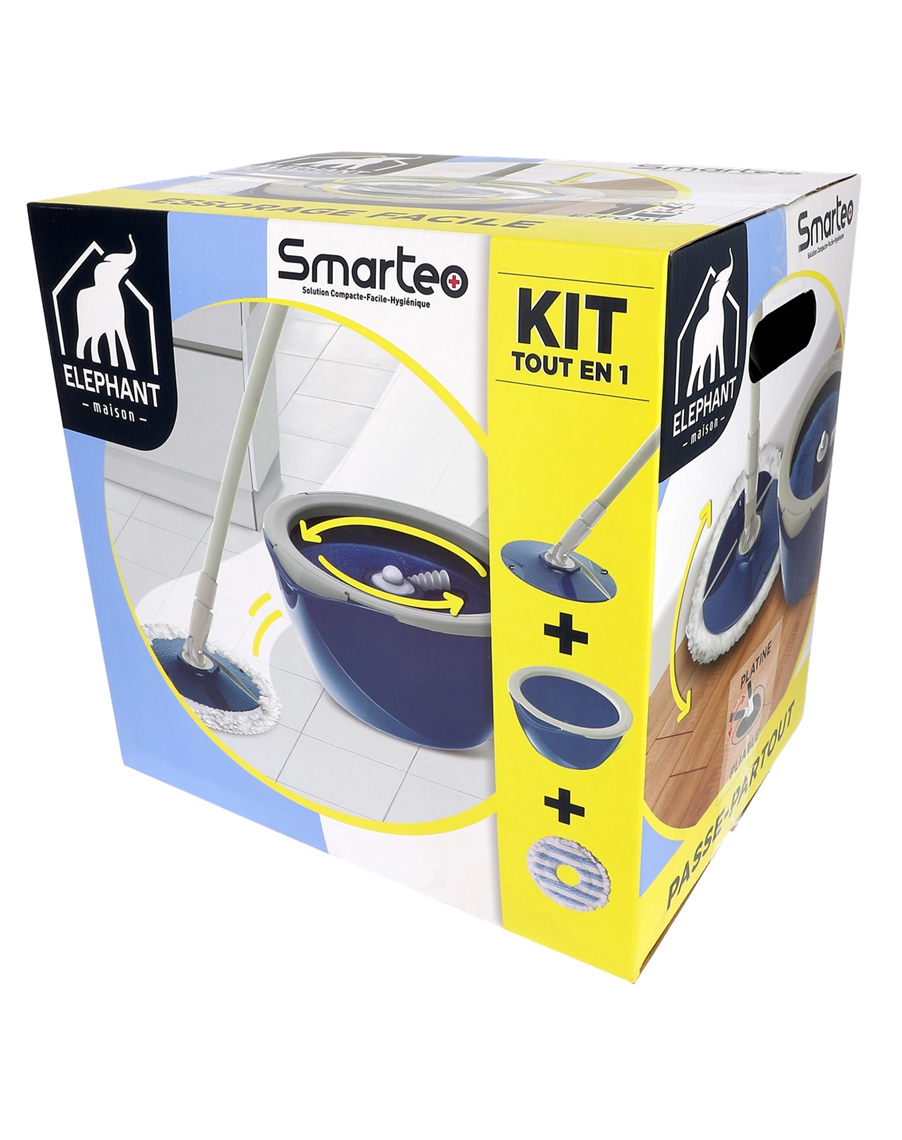 Tellement plus facile de laver ses sols avec Smarteo ! Ce kit complet et compact comprend un balai avec sa housse en microfibre et un seau avec un essoreur intégré. Les peignes grattants nettoient la housse lors de l’essorage. La platine pliable permet de nettoyer les plinthes et contremarches de vos escaliers. Astucieux, il prendra peu de place chez vous. Idéal pour s’équiper totalement et simplement