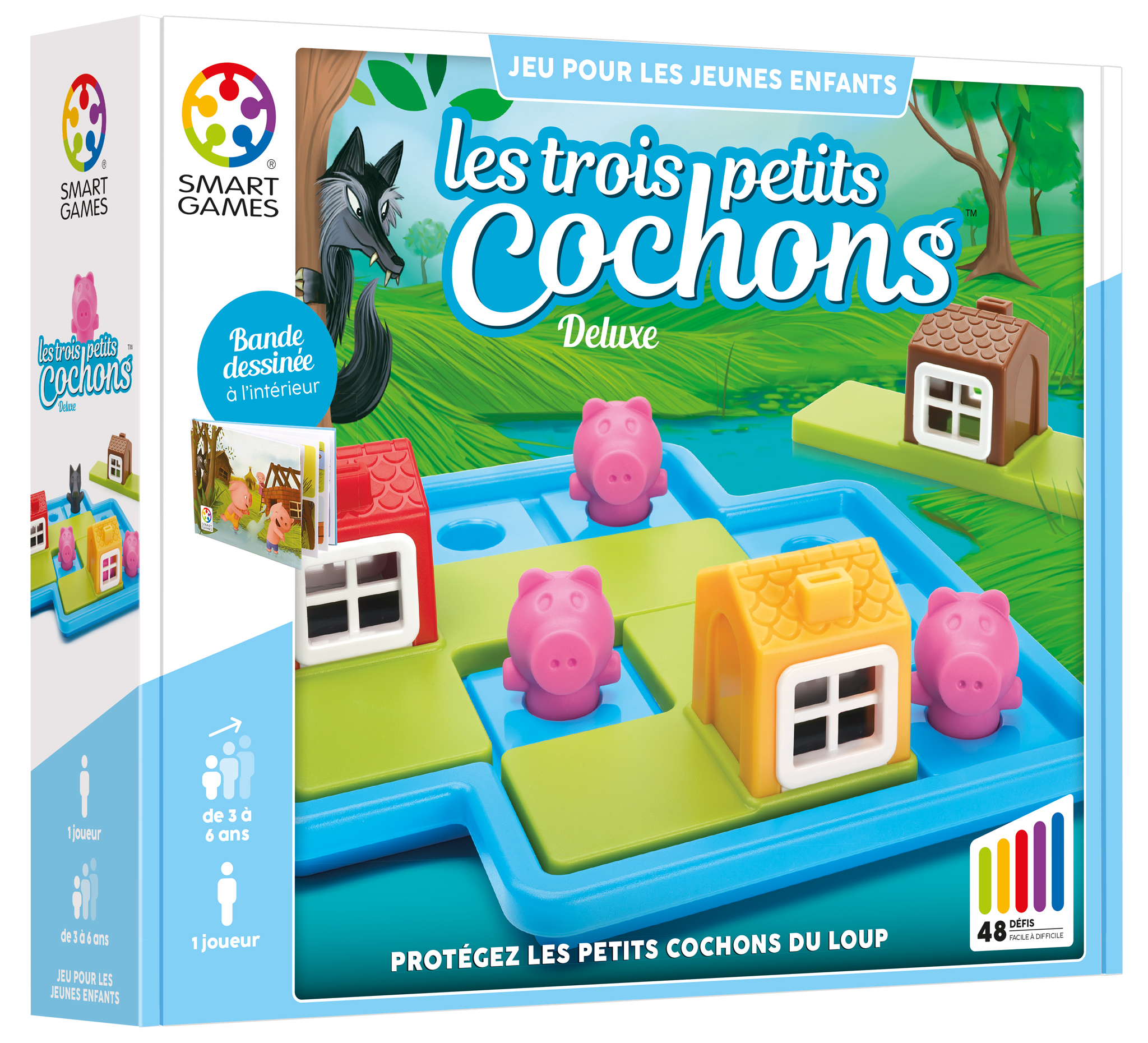 « Les Trois Petits Cochons » est un jeu de réflexion idéal pour les jeunes enfants. Vous y trouverez 3 grosses pièces de jeu juchées de maisons ainsi que 4 figurines (lescochons et le loup) faciles à manipuler. Les enfants adoreront voir les cochons regarder à travers les fenêtres de leur maison. Vous trouverez également un livre de conte illustré ainsi qu’un livret de 48 défis.