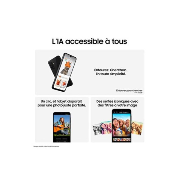 Le Galaxy A26 5G allie design moderne, puissance et intelligence pour vous accompagner au quotidien. Son écran Super AMOLED 6.7’’ FHD+ à 120 Hz offre une fluidité et un confort visuel optimal pour profiter pleinement de vos films, séries et jeux.