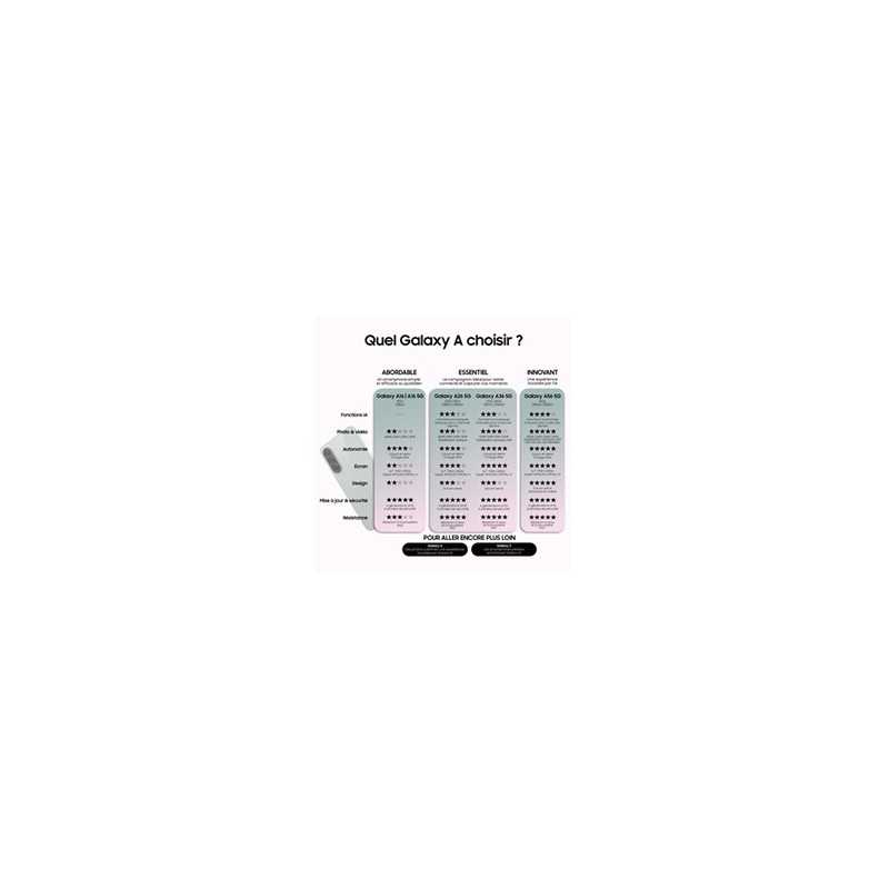 Simplifiez-vous la vie avec l’IA intégrée au Galaxy A36 5G. Recherchez zen un instant avec Entourer pour chercher, laissez Gemini vous assister dans vos tâches quotidiennes et profitez d’outils de retouche photo intelligents pour sublimer vos clichés en un geste. Au-delà de ses fonctionnalités intelligentes, le Galaxy A36 5G séduit par son design élégant aux bords plats et ses coloris vibrants. Son écran Super AMOLED 6.7’’ en Full HD+ vous plonge au cœur de vos contenus préférés avec des couleurs éclatantes et des contrastes profonds. Propulsé par le processeur Snapdragon 6 Gen 3, il offre une expérience fluide et réactive, idéale pour passer d’une application à une autre en toute simplicité. Son triple capteur photo et sa caméra selfie capturent chaque instant avec précision, même en basse lumière. Vous pouvez compter sur les 6 générations de mises à jour OS et 6 années de mises à jour sécurité pour un smartphone toujours performant et protégé. Côté autonomie, profitez d’une batterie longue durée allant jusqu’à deux jours et demi ainsi que d’une charge ultra-rapide 45W pour rester connecté en toute sérénité. Un smartphone intelligent, conçu pour vous simplifier la vie. Découvrez le Galaxy A36 5G dès maintenant.
