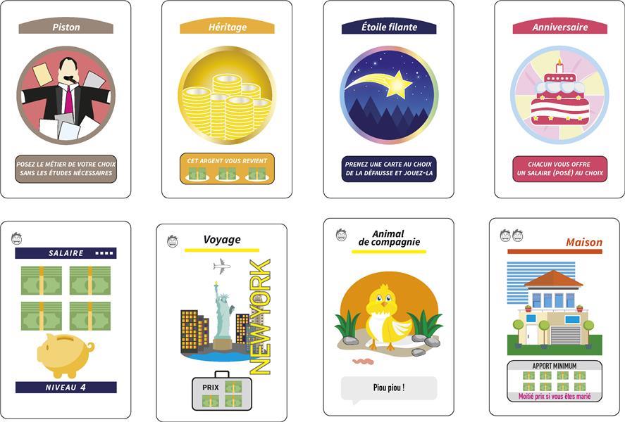 Posez des cartes face à vous pour faire votre vie. Les smiles, inscrits en haut à gauche des cartes posées, indiquent votre niveau de bonheur. Le but du jeu est d'en avoir le plus possible. Le jeu s'arrête quand la pioche est finie Contenu : 200 cartes : 25 études, 30 métiers, 40 salaires, 20 flirts, 7 mariages, 3 adultères, 10 enfants, 37 malus, 10 cartes spéciales, 15 acquisitions (5 maisons, 5 voyages, et 5 animaux de compagnie), 3 distinctions.