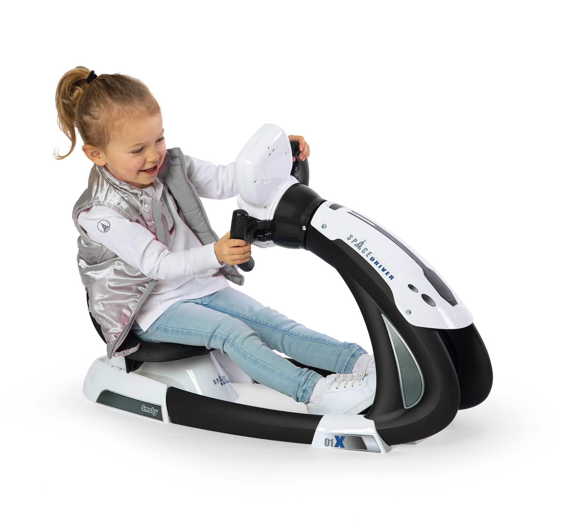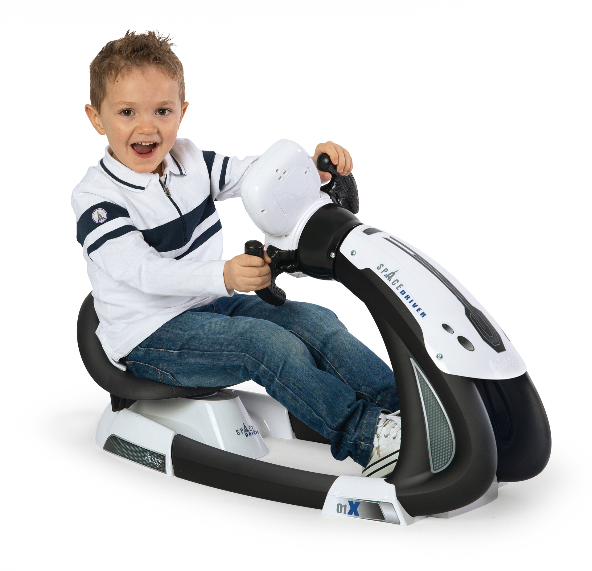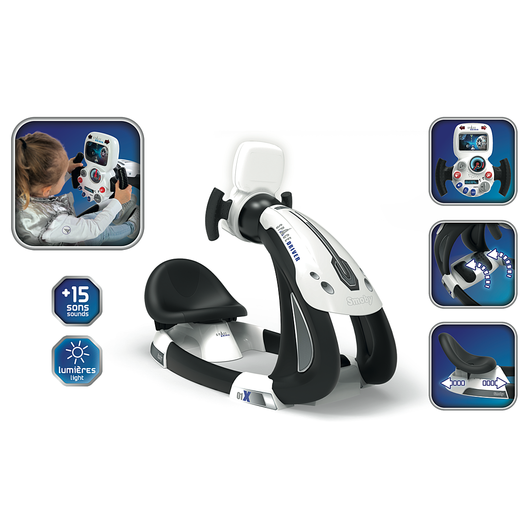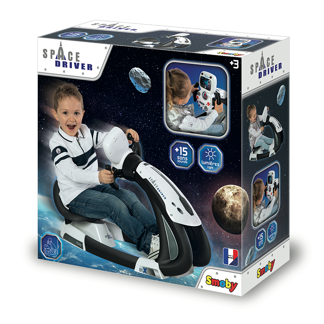 Grâce au simulateur de conduite Space Driver, tu vas pouvoir plonger dans l'univers de l'espace ! Avec l'assise très confortable et les 3 positions de conduite, tu pourras passer des heures entières à jouer tout en étant à l'aise ! Son volant électronique avec circuit animé et écran rétro éclairé saura te satisfaire puisque tu seras directement plongé dans l'Univers aux commandes d'une navette spatiale ! Pour encore plus de réalisme, près de 15 sons et une simulation de panne y sont intégrés. La fonction boost et la marche arrière donnent encore plus de possibilités de jeu ! 3 piles AA/LR6 non incluses. A partir de 3 ans. Fabrication française.