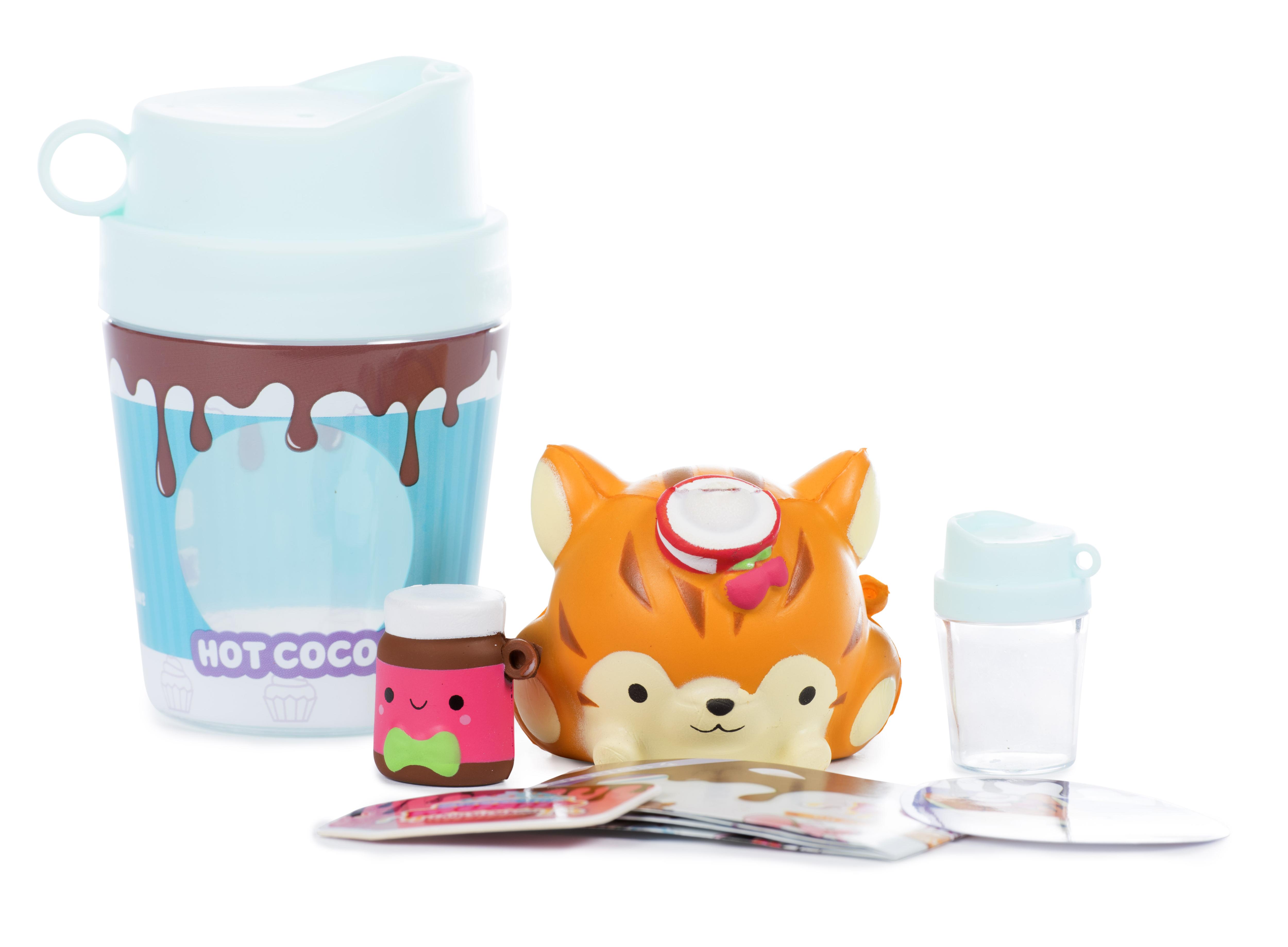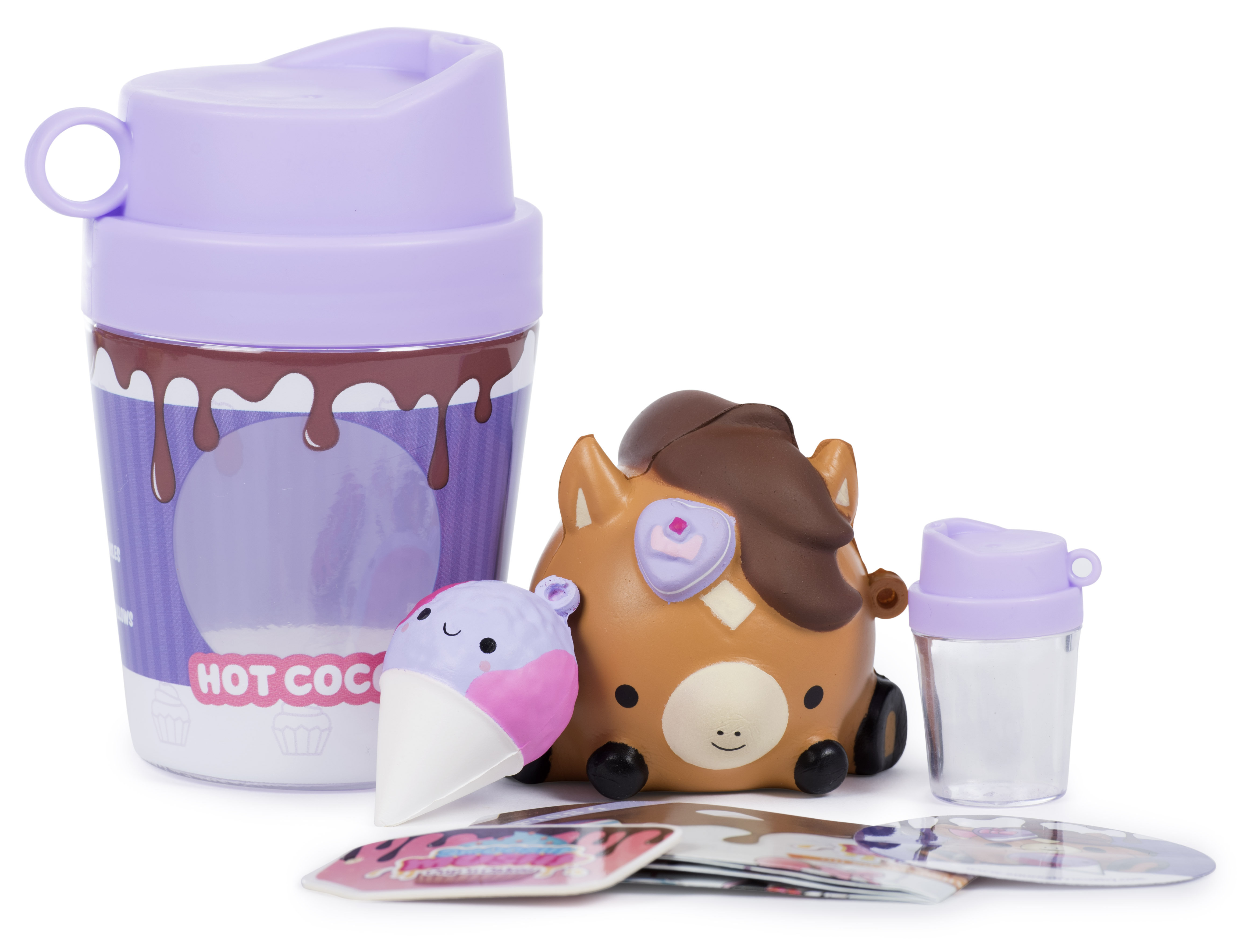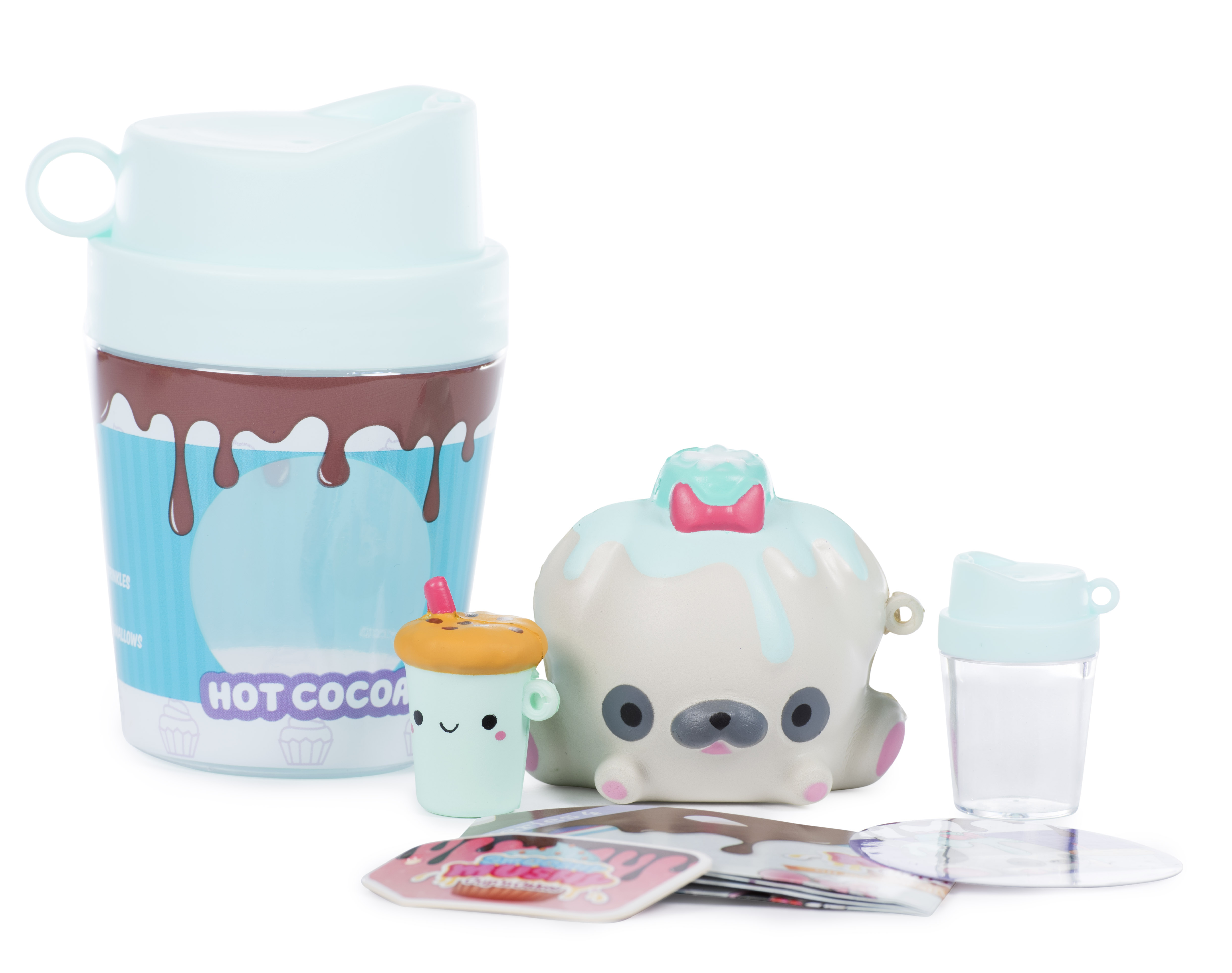 Tous les personnages Smooshy à collectionner ! Glissés dans des cup de café, il y a plein de Smooshy Surprises à découvrir. Chaque cup de café contient : Un Smooshy, une étiquette, un leaflet, un sticker, une mini-bouteille, un Besties et 2 mini-chaînes !