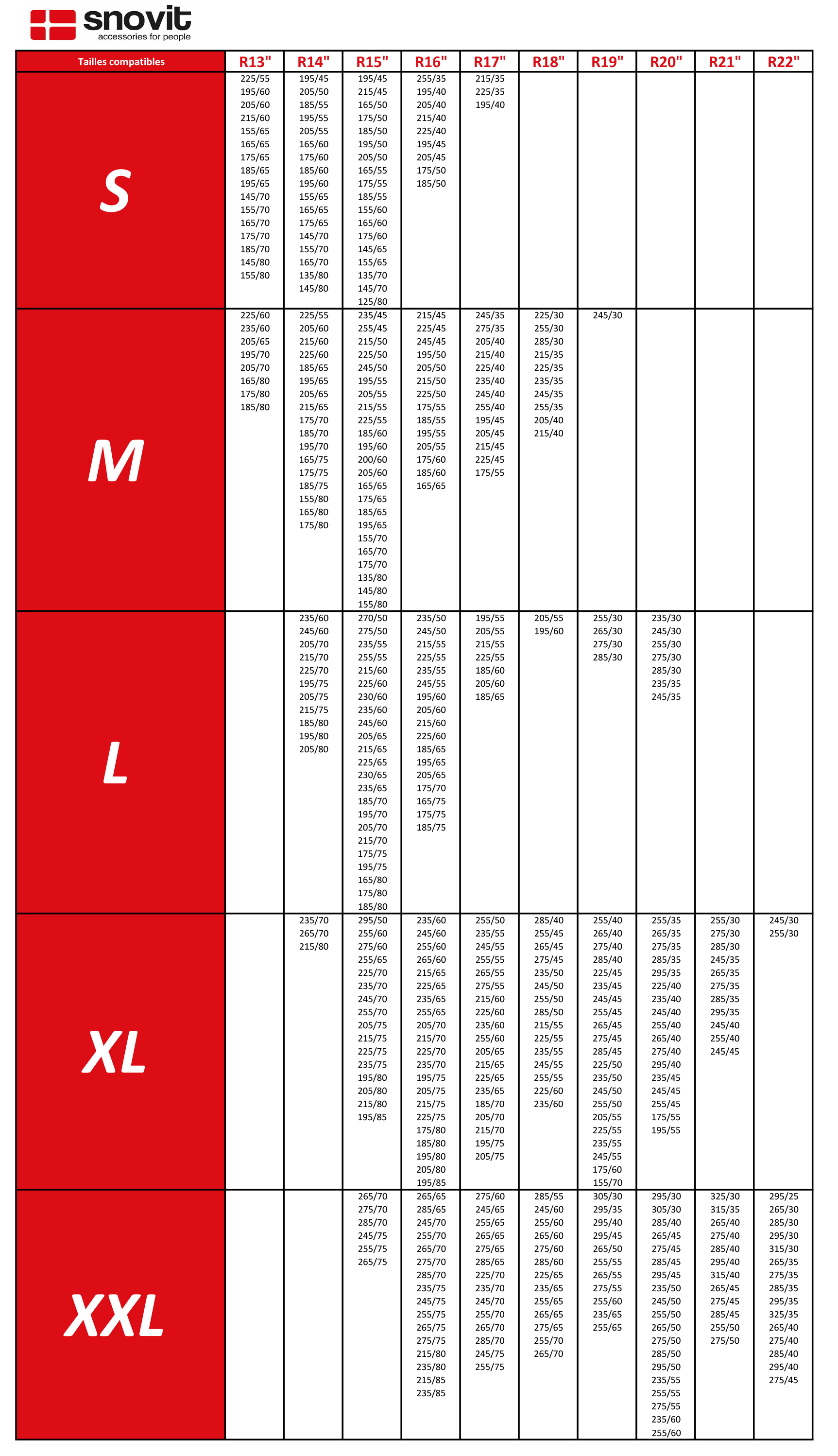 Le design breveté du type de tissage allié à du polyester haute résistance confère un excellent grip sur glace ou neige. Le tressage 3D des fibres permet une meilleure longévité et optimise aussi le grip. Les élastiques avant/arrière permettent un montage/démontage facile et rapide. Un set comprend : Une paire de chaussettes SNO-VIT + Une paire de gants + Un sac de stockage. Tailles de pneus compatibles : R14 235/60-245/60-205/70-215/70-225/70-195/75-205/75-215/75-185/80-195/80-205/80 & R15 270/50-275/50-235/55-255/55-215/60-225/60-230/60-235/60-245/60-205/65-215/65-225/65-230/65-235/65-185/70-195/70-205/70-215/70-175/75-195/75-165/80-175/80-185/80 & R16 235/50-245/50-215/55-225/55-235/55-245/55-195/60-205/60-215/60-225/60-185/65-195/65-205/65-175/70-165/75-175/75-185/75 & R17 195/55-205/55-215/55-225/55-185/60-205/60-185/65 & R18 205/55-195/60 & R19 255/30-265/30-275/30-285/30 & R20 235/30-245/30-255/30-275/30-285/30-235/35-245/35