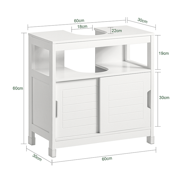 Meubles moderne au design parfait, se glisse sous un lavabo sur colonne ou un évier sur pied. Il vous offrira de l'espace de rangement avec ses portes coulissantes et sa niche de rangement intérieure. Une solution de rangement pour gagner de la place et garder votre salle de bain rangée et organisée. Ce meuble avec appui au sol d'une largeur de 60 cm et d'une profondeur de 30 cm est idéal pour rendre votre salle de bain accessible et intelligente. Grâce à la niche, l’armoire basse peut être placée sous tous les lavabos. Avec le coussin de pied, la peinture peut être mieux protégée de l'humidité. Caractéristiques : - Matériau : Bois MDF de lasse E1 laqué blanc.- Dimensions (BxLxH) 60 x 30 x 61 cm. Œillet L18,5 x P22 cm.- Capacité Max : 30kg (10kg/étage). - Dimensions de l’emballage : 68,5x38,5x15cm. - Poids de l’envoi : 9,5kg.- Le lavabo n’est pas fourni. - Cet article est livré sans éléments décoratifs des photos. Livraison : meuble sous lavabo, notice de montage détaillée. Avec la notice de montage illustrée et les pièces numérotées, le montage est facile. L’ensemble de 4 pièces: meuble sous-vasque (FRG128), miroir (FRG129), meuble colonne de salle de bain (FRG126) et meuble demi-colonne (FRG127). Meuble pour lavabo suspendu : FRG128-W. Facture fournie.| EAN | 4251388613450 |