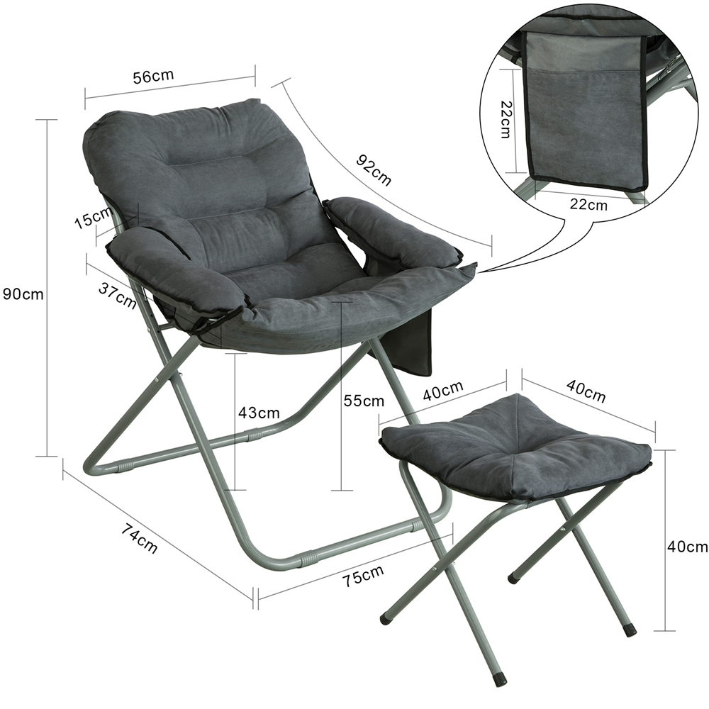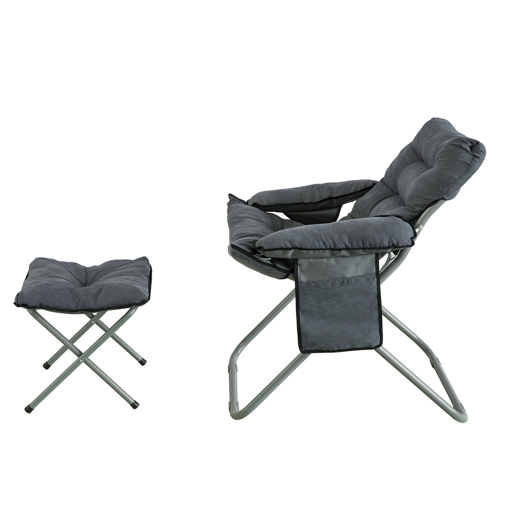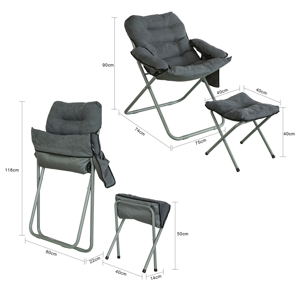 Ce fauteuil inclinable et repose-pieds est très adaptés pour une utilisation dans différents espaces, loisirs sur le balcon, chambre et bureau, pause déjeuner au bureau et au bureau, jeux et films dans le dortoir, sacs de rangement intimes, faciles à transporter et petits objets. La chaise et le repose-pieds sont pliables et peuvent être pliés en quelques secondes pour un rangement facile. La taille de la chaise pliée : 80 x 22 x 118 cm. La taille du tabouret plié : 40x14x50 cm. Les cadres sont composés de tubes en fer robuste. Tissu d'assise de chaise : Tissu Oxford + daim. Avec de bonnes performances de charge et une bonne résistance à la compression. Capacité de charge max.: 150 kg. Dimensions de la chaise (L x p x h): 75 x 74 x 90 cm. Dimensions du tabouret : 40 x 40 x 40 cm. Dimensions de l’emballage : 113 x 66 x 11 cm. Pas besoin de l'assembler, il peut être utilisé après dépliage. Avec la Facture.
