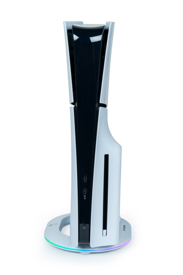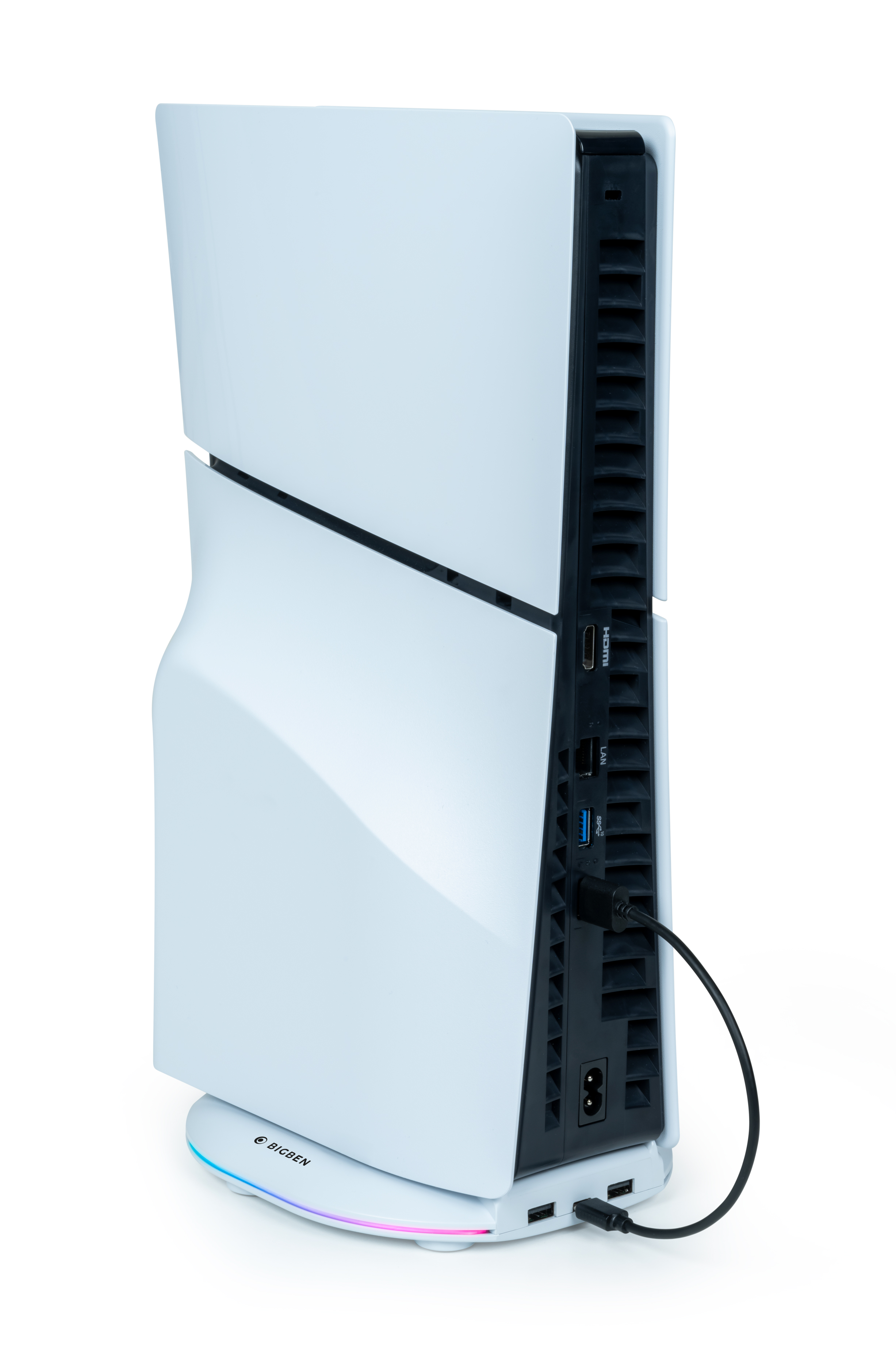 Socle pour PlayStation 5 \"\"slim\"\". Permet de disposer la console à la verticale en toute sécurité avec les pieds antidérapants. Socle équipé de 2 ports USB-A à l'arrière pour la charge et le transfert de données. Bandeau RGB avec 14 effets lumineux. Fourni avec le câble de charge.