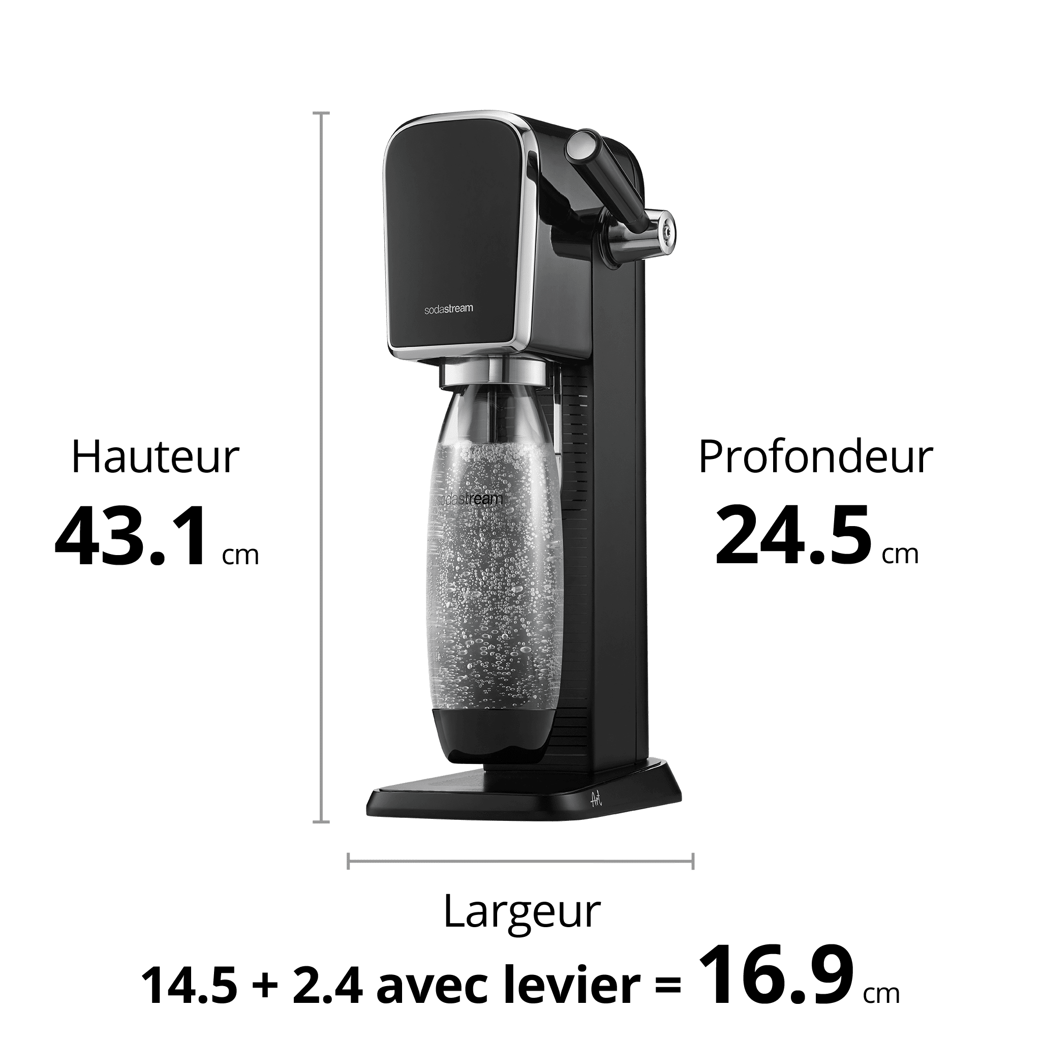 La machine ART noire pack promo est livrée avec : •1 machine ART prête à l’emploi permettant de réaliser vos boissons préférées sans les bouteilles en plastique à usage unique. •1 cylindre équipé de la technologie brevetée Cylindre Quick Connect à clipser permettant de réaliser jusqu’à environ 60L d’eau pétillante •1 bouteille de gazéification en grand modèle 1L fuse compatible lave vaisselle Les PLUS produit : • Design : nouveau design révolutionnaire qui augmente l’utilisation consommateur de +30 • Flexibilité : bouteilles réutilisables format nomade pour intérieur & extérieur • Durabilité : Bouteilles compatibles lave vaisselle • Facile et intuitif : avec la technologie brevetée Cylindre Quick Connect à clipser