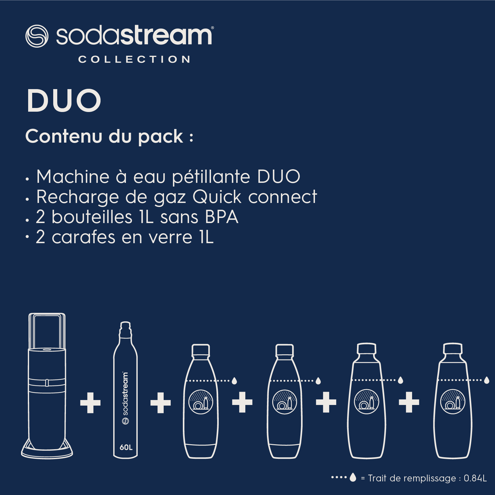 • 1 machine DUO prête à l’emploi permettant de réaliser vos boissons préférées sans les bouteilles en plastique à usage unique.
