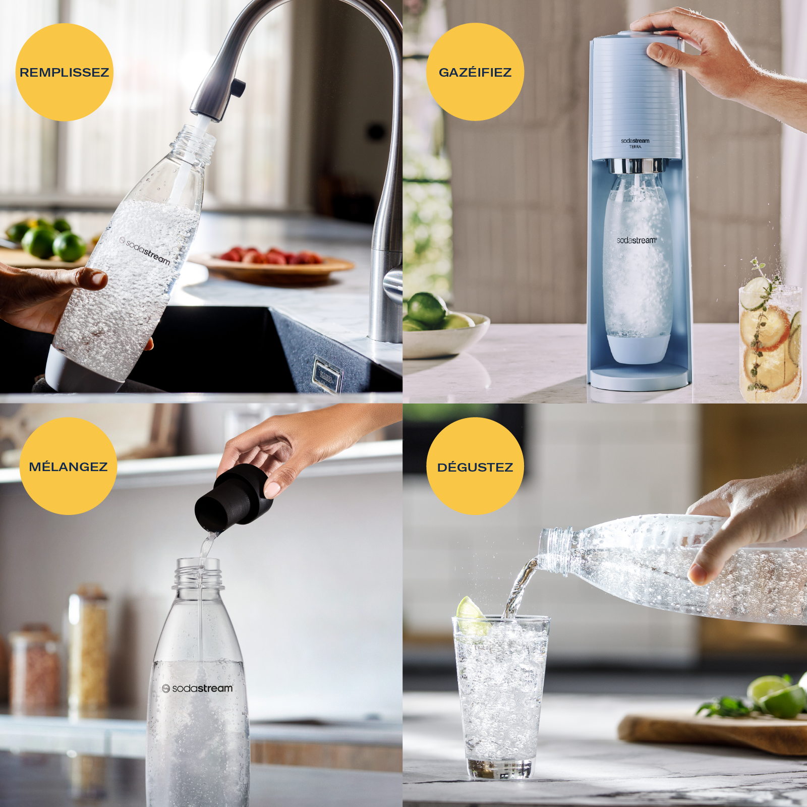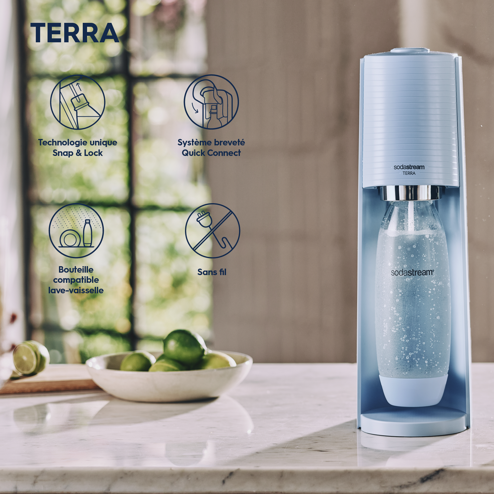 | Libellé | SodaStream TERRA Machine à Eau Pétillante et Soda | Pack 1 Bouteille 1L + 1 Recharge de Gaz 60L | Bleue |