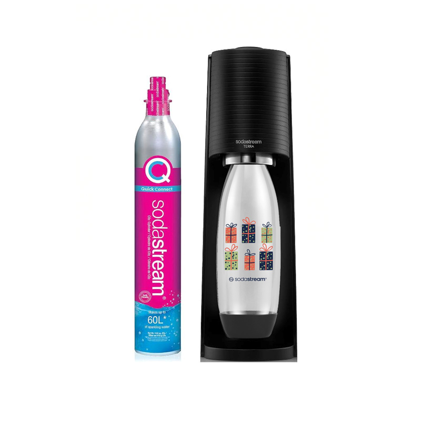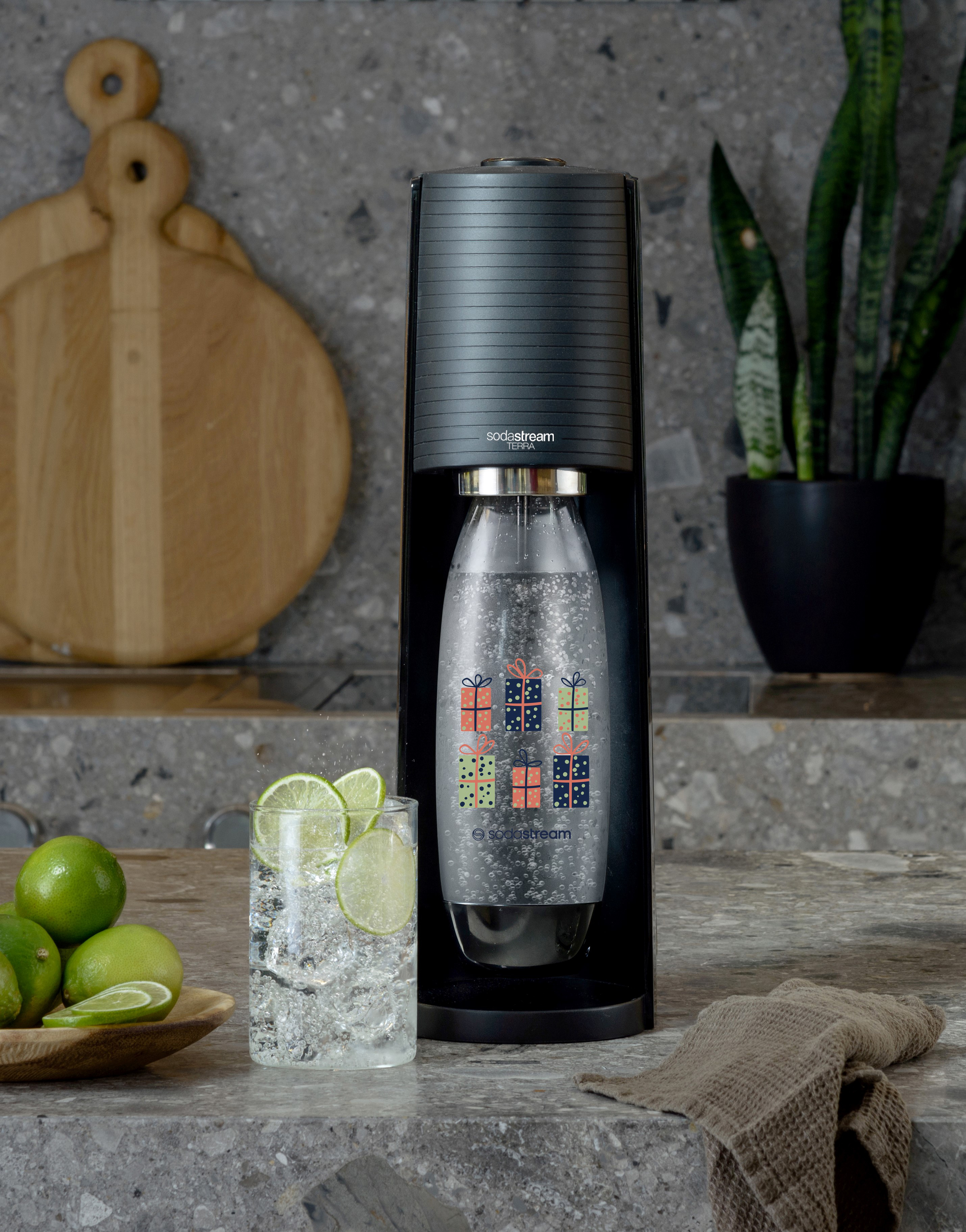 SodaStream TERRA Machine à Eau Pétillante et Soda | Pack 1 Bouteille 1L design cadeaux + 1 Recharge Noire