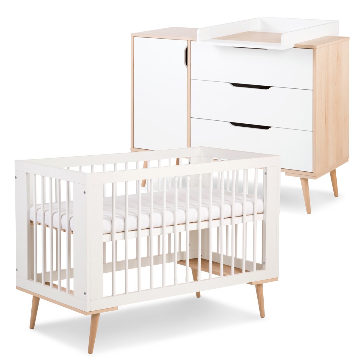 Cet ensemble élégant et harmonieux de style scandinave est composé d'un lit bébé et d'une commode à langer.