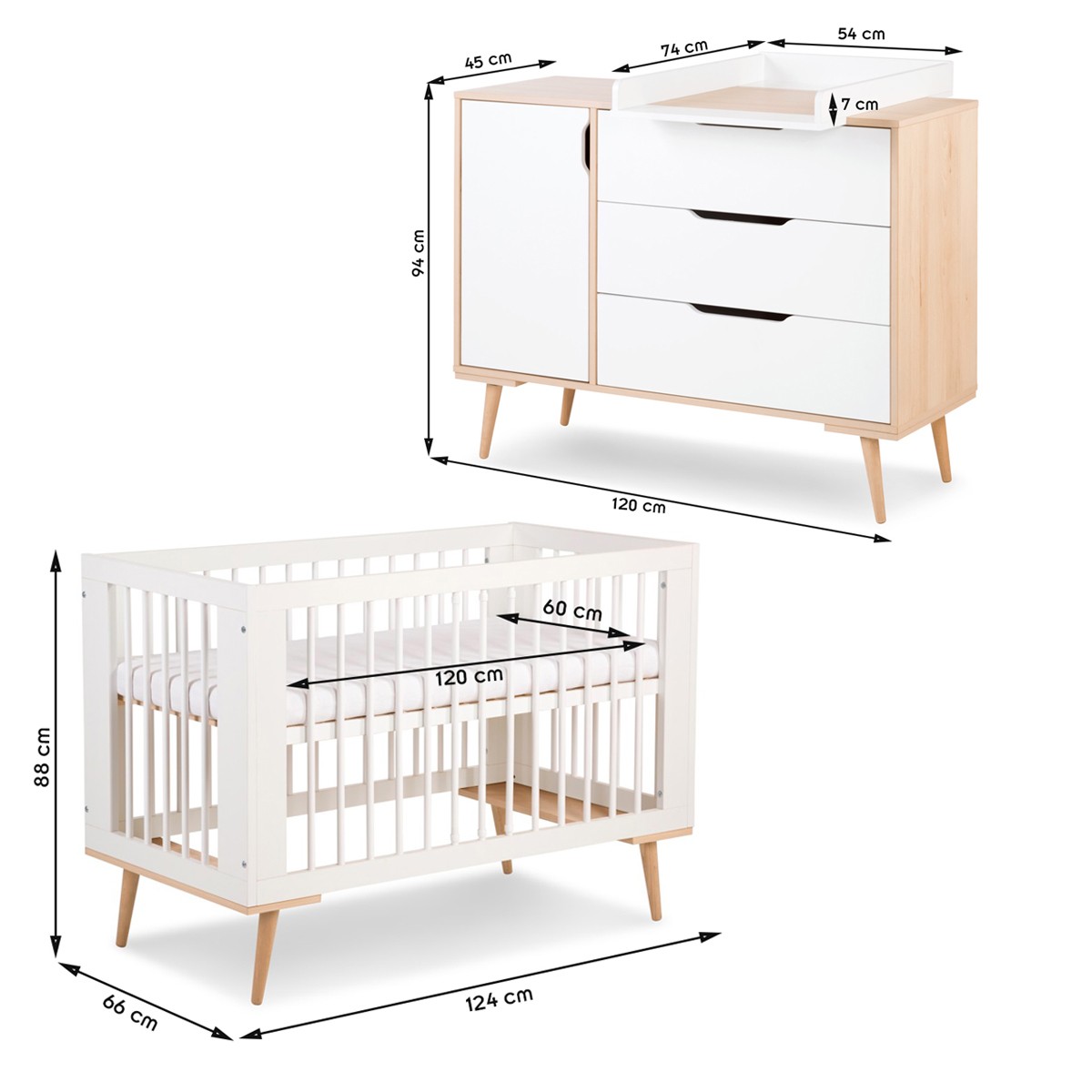 SOFIE Ensemble commode à langer et lit style scandinave Dès la naissance. Existe en plusieurs modèles. CARACTÉRISTIQUES : Cet ensemble élégant et harmonieux de style scandinave est composé d'un lit bébé et d'une commode à langer. Lit SOFIE : La hauteur du sommier est ajustable, il se règle sur 3 hauteurs différentes en fonction de l'évolution de l'enfant. Sur un côté, 3 barreaux peuvent être ôtés afin de permettre à l'enfant de sortir du lit seul. Matelas non inclus. En bois de pin, MDF et hêtre. Commode SOFIE : Cette commode dispose d'un grand espace de rangement : 3 grands tiroirs sur rails coulissants ainsi qu'une porte avec, à l'intérieur, 3 étagères. Elle est livrée avec un plan à langer amovible. Le grand espace autour du plan à langer permet d'avoir les accessoires de bébé à portée de main. Il peut être placé au centre des 3 tiroirs ou au dessus des étagères, facilitant l'accès au tiroir du haut. En aggloméré et hêtre. Les pieds du lit et de la commode sont en hêtre. Fabriqué en Union Européenne. Peinture à l'eau. À monter. Matelas à langer non inclus. DIMENSIONS ET POIDS : Dimensions extérieures du lit : L 124 cm x l 66 cm x H 88 cm Dimensions intérieures du lit : L 120 cm x l 60 cm Poids total : 24 kg. Dimensions commode sans plan à langer : L 120 cm x l 45 cm x H 94 cm Dimensions plan à langer : L 74 cm x l 54 cm x H 7 cm Dimensions commode avec plan à langer : L 120 cm x l 74 cm x H 101 cm Poids total : 55 kg.