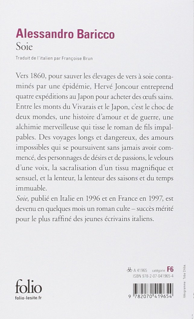 Vers 1860, pour sauver les élevages de vers à soie contaminés par une épidémie, Hervé Joncour entreprend quatre expéditions au Japon pour acheter des oeufs sains. Entre les monts du Vivarais et le Japon, c'est le choc de deux mondes, une histoire d'amour et de guerre, une alchimie merveilleuse qui tisse le roman de fils impalpables. Des voyages longs et dangereux, des amours impossibles qui se poursuivent sans jamais avoir commencé, des personnages de désirs et de passions, le velours d'une voix, la sacralisation d'un tissu magnifique et sensuel, et la lenteur, la lenteur des saisons et du temps immuable. Soie, publié en Italie en 1996 et en France en 1997, est devenu en quelques mois un roman culte - succès mérité pour le plus raffiné des jeunes écrivains italiens.