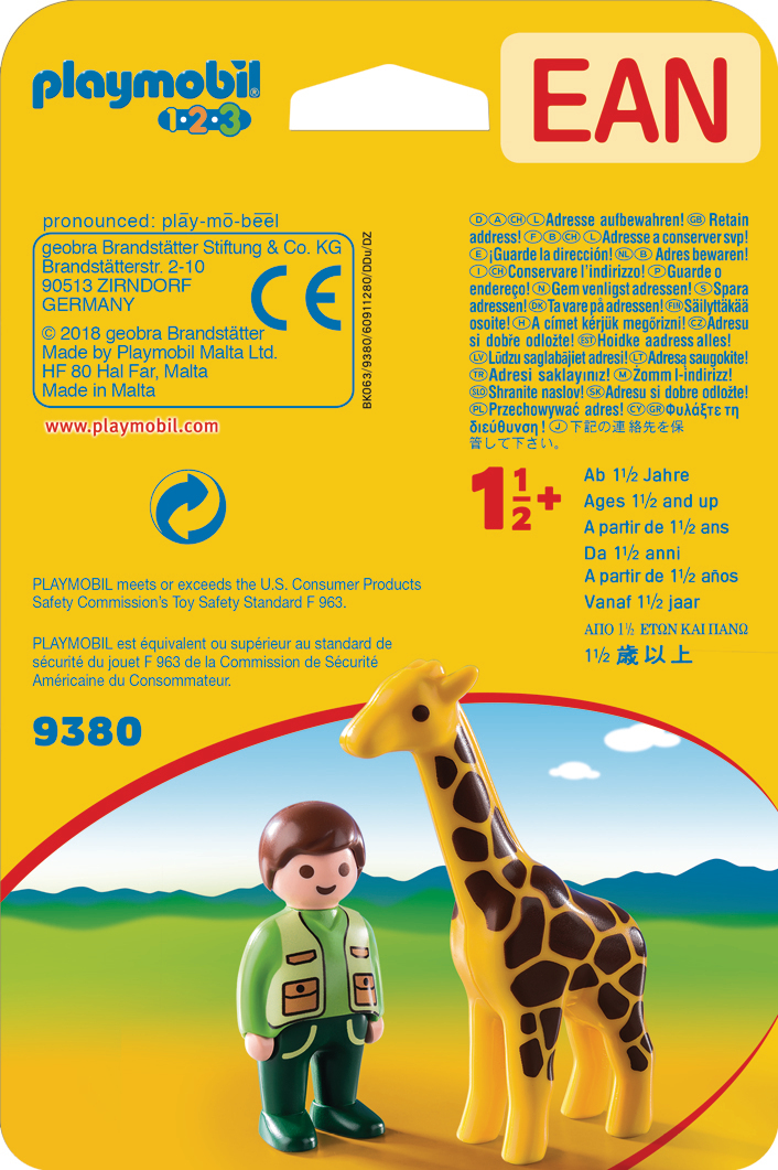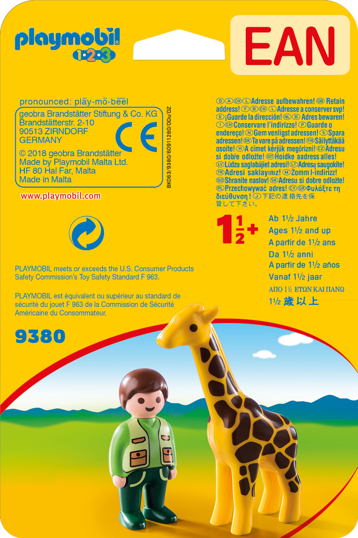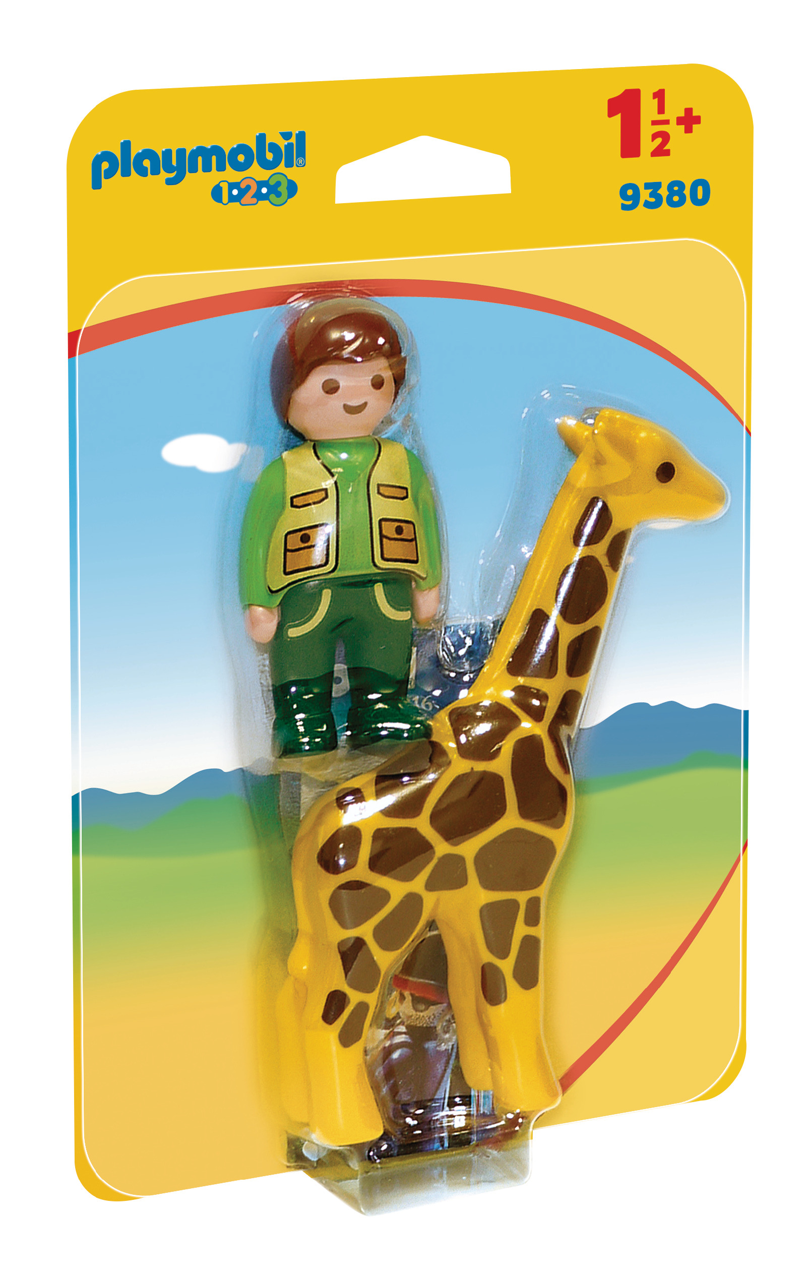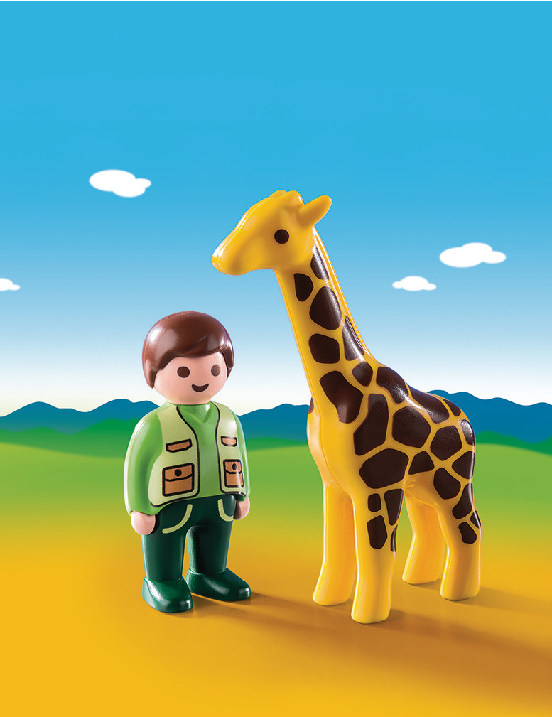 Le soigneur soccupe de la girafe. Elle se sent maintenant beaucoup mieux. Avec ses couleurs claires et ses formes rondes, la gamme PLAYMOBIL®-1.2.3 est particulièrement adaptée aux petites mains.