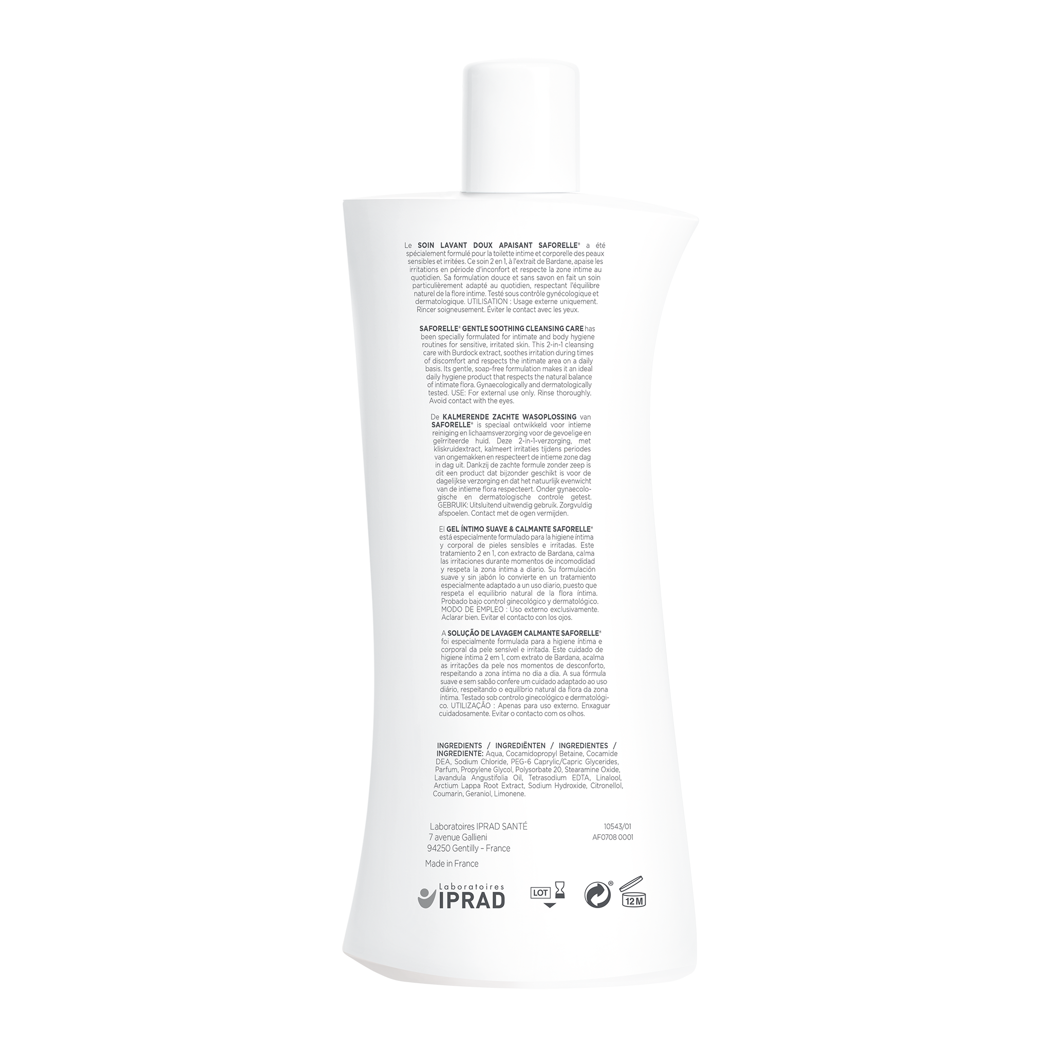 Hygiène intime et corporelle : protège et apaise les peaux sensibles ou irritées Le Soin Lavant Doux Saforelle a été spécialement formulé pour les peaux sensibles ou irritées. Il nettoie en douceur et calme irritations et sensations d’inconfort. Son pH alcalin doux et sa formulation enrichie en Bardane et agent surgras en font un soin particulièrement adapté à un usage quotidien respectant l’équilibre naturel de la peau*. Le produit d’hygiène intime et corporelle de référence recommandé par les gynécologues depuis plus de 20 ans. Pour une tolérance optimum: - Formule sans savon, s, sans colorants, l. - Testé sous contrôle médical par des gynécologues et des dermatologues.* Etudes INSERM Lille 2003 et 2009