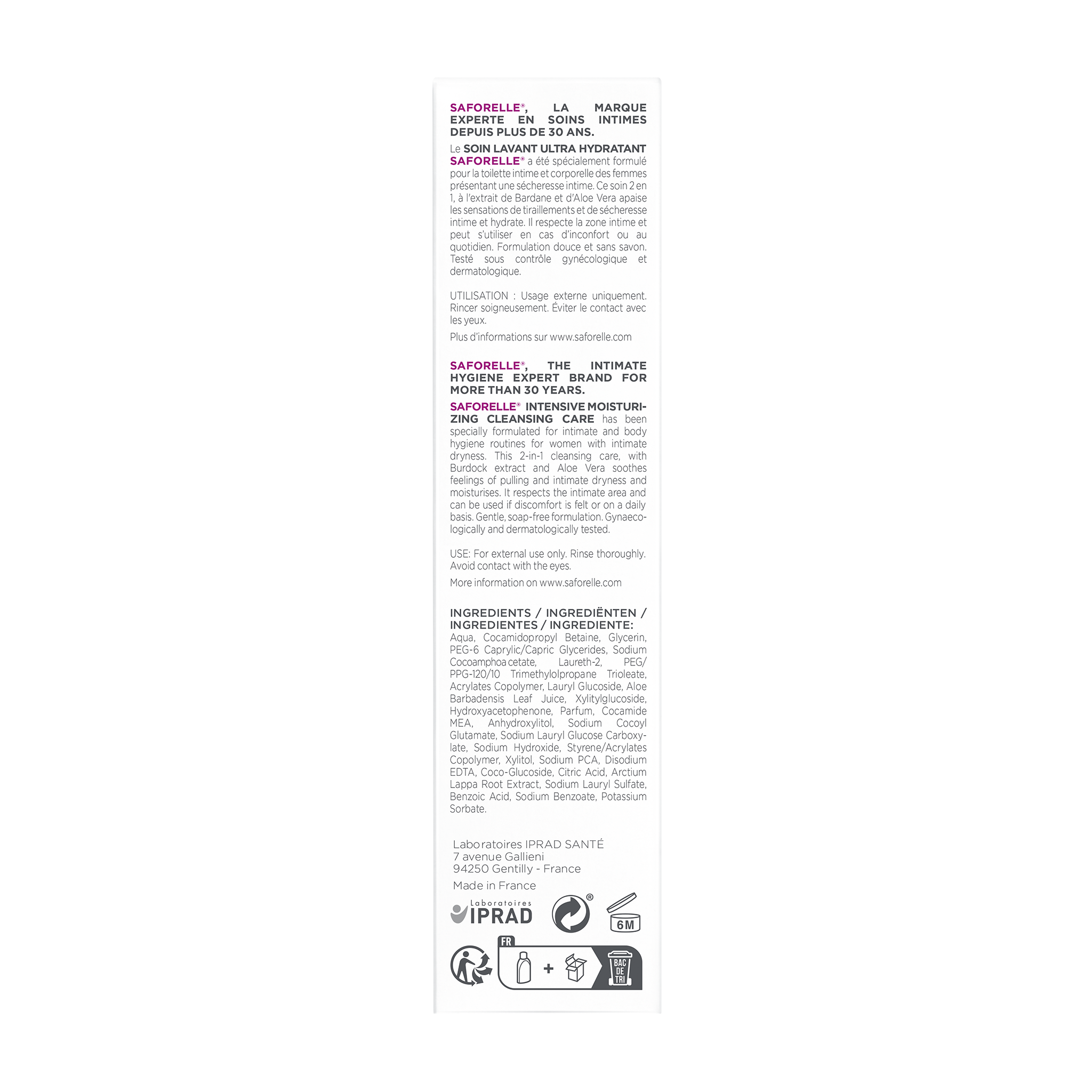 Le Soin Lavant Ultra Hydratant Saforelle a été spécialement formulé pour les femmes présentant des signes de sécheresse intime pouvant être dus à la prise de certains médicaments, à une variation hormonale comme celle liée à la ménopause … Grâce à sa formule qui allie agents surgras, extraits naturels d’Aloe Vera et de Bardane, le Soin Lavant Ultra Hydratant participe à une meilleure hydratation, source de confort intime, et permet une toilette quotidienne en douceur. Sa formule est sans savon,. Le Soin Lavant Ultra Hydratant a été testé sous contrôle médical par des gynécologues et des dermatologues.