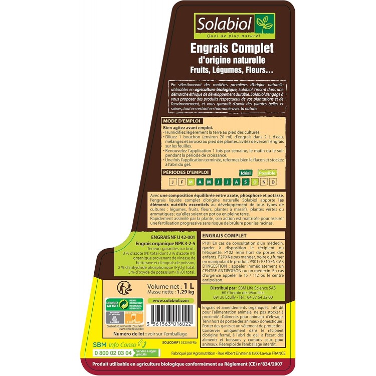 | Libellé | SOLABIOL Engrais Liquide Complet - 1L - Facile à Doser SOLICOMP1 |