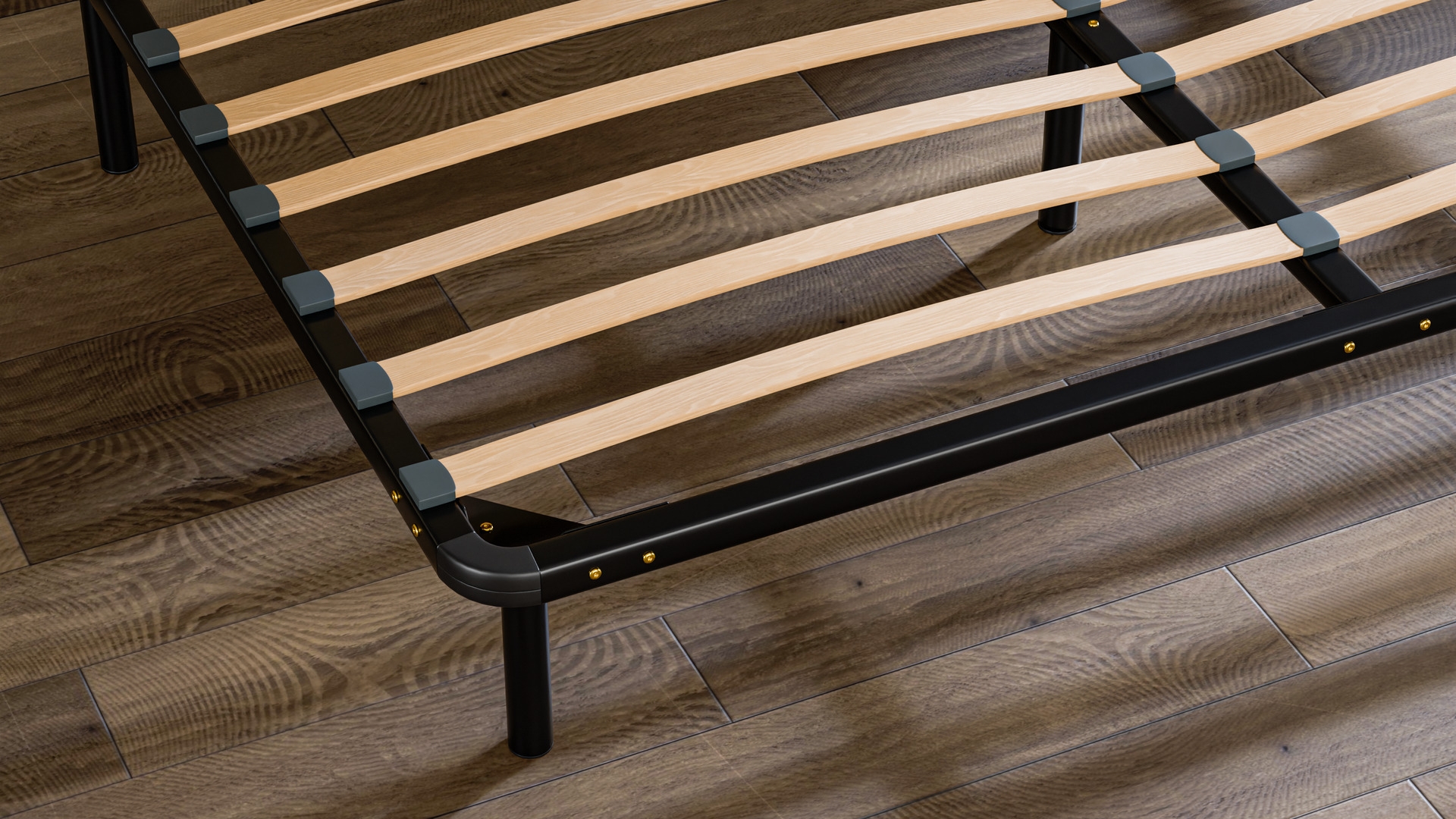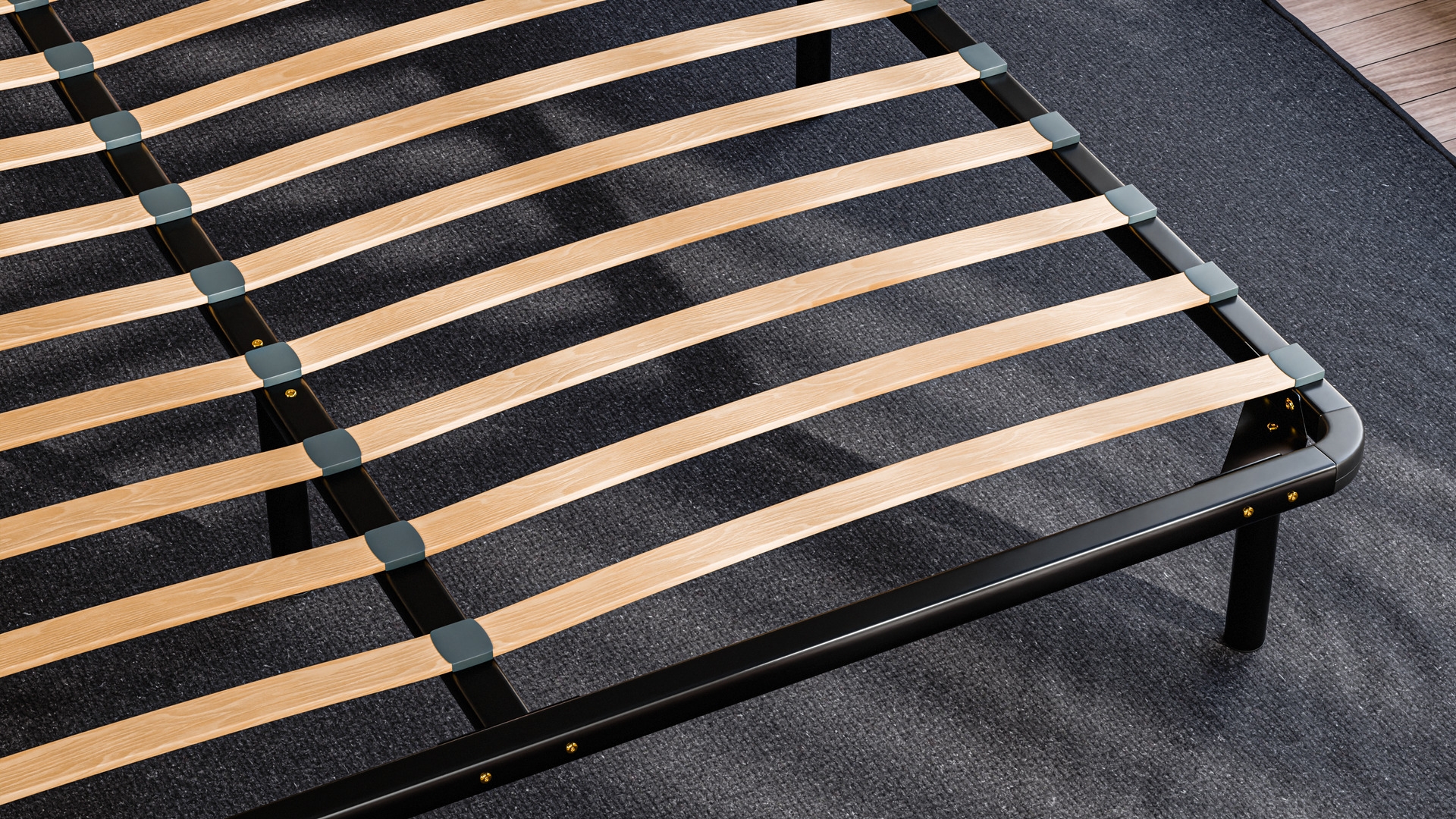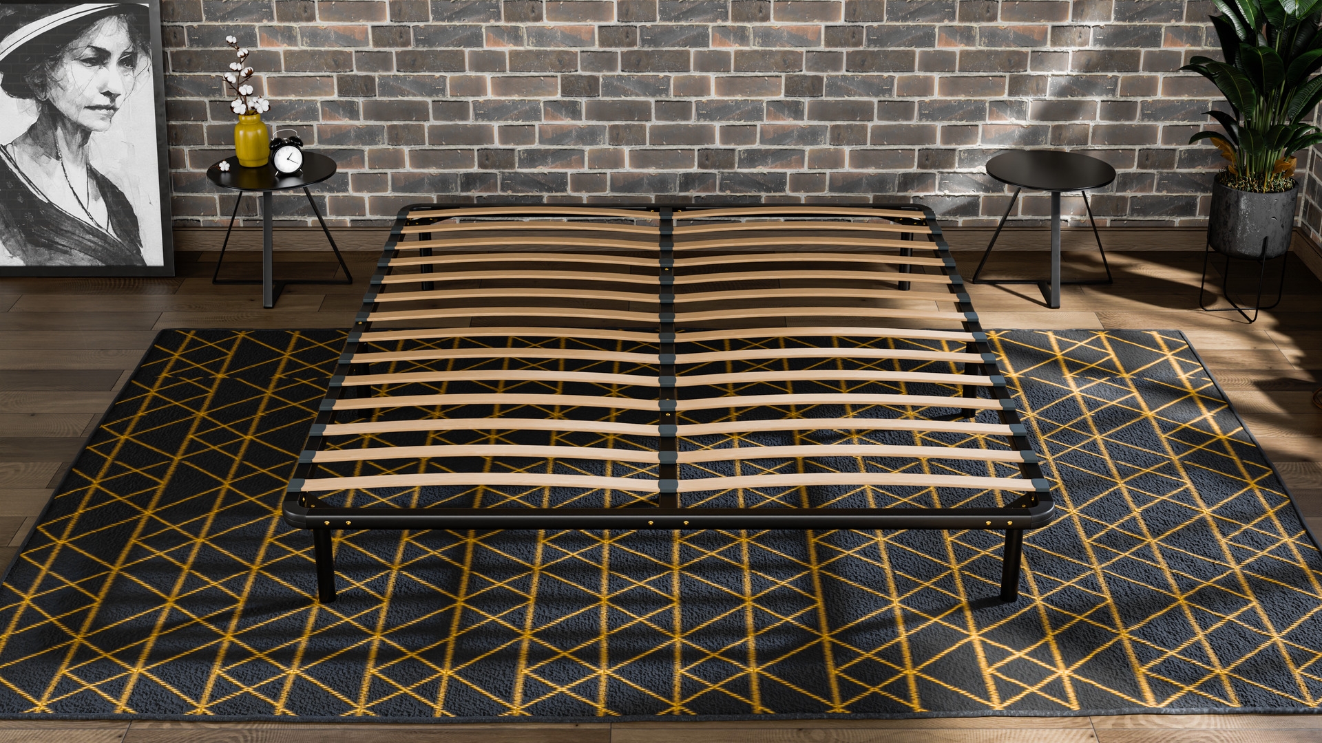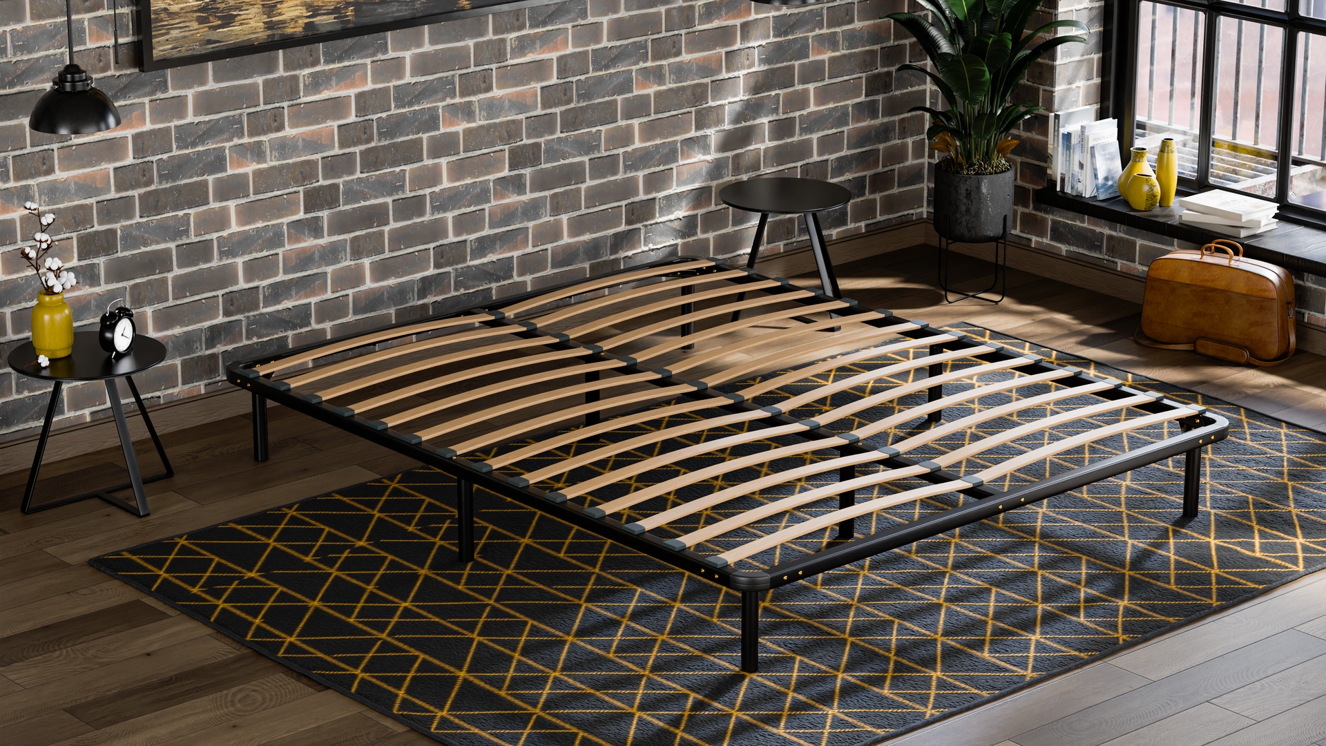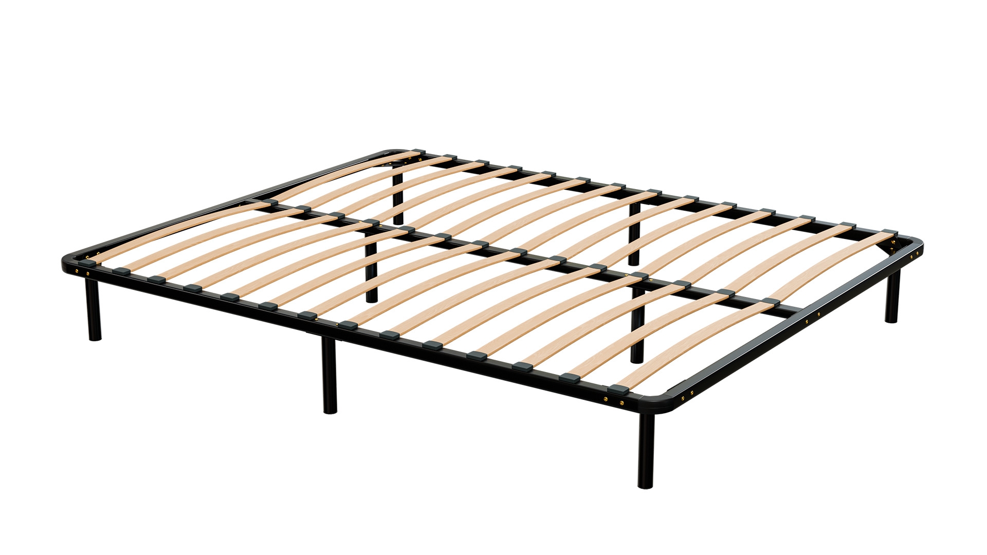 Le sommier à lattes combine fonctionnalité et économie. Sa structure en métal tubulaire, peinte en époxy noir, offre une résistance remarquable, tandis que les lattes actives en bois multiplis de peuplier favorisent un soutien souple et une meilleure hygiène par une aération efficace du matelas.