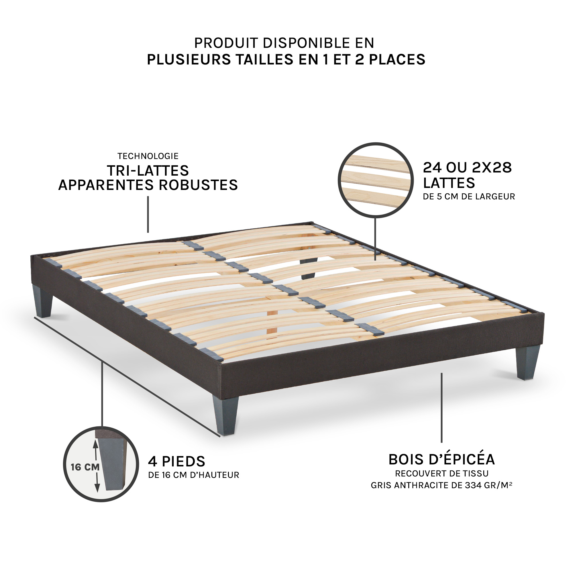 Offrez-vous le sommeil des sportifs de haut niveau ! Performance, récupération, énergie... Olympe mise sur la technologie et la Recherche & Développement pour concevoir sa gamme de matelas et répondre ainsi aux besoins des sportifs et de celles et ceux qui souhaitent une bonne literie. Fabricant français, nous proposons des produits fabriqués à partir de matériaux de qualité et aux finitions soignées, tous labellisés CertiPUR et Oeko-Tex. Le sommier Kit15 est un sommier à lattes réunissant qualité et élégance. Composé de bois en majeure partie issu de forêts gérées durablement, il est habillé d'un joli tissu gris anthracite qui se marie parfaitement avec tous types d'intérieurs. Doté de la technologie tri-lattes, il permet également d'assouplir le confort du matelas pour un bien-être optimal. Enfin, il est livré en kit (en un seul carton) avec notice de montage pour un transport facile.