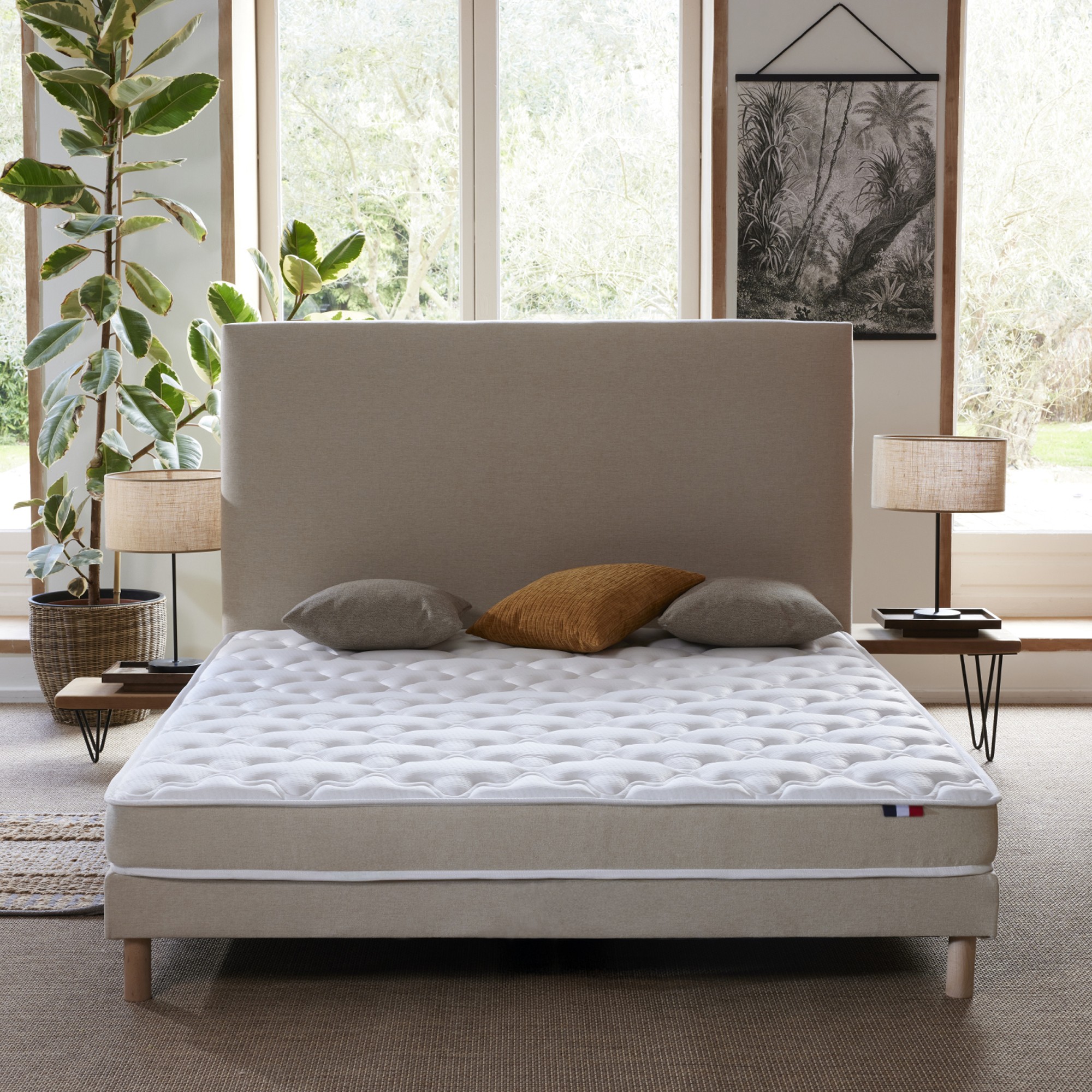 Sommier tapissier en kit à lattes, beige Alliez praticité et élégance avec ce sommier tapissier en kit beige. Son design raffiné et sa conception robuste en font une base idéale pour sublimer votre literie. Un confort amélioré grâce aux lattes flexibles Doté de 54 lattes flexibles (tri-lattes), ce sommier accompagne les mouvements naturels du corps et optimise les performances de votre matelas. Il favorise une meilleure répartition des points de pression et un maintien homogène, pour des nuits reposantes et un réveil sans tensions. Une Structure solide et responsable Fabriqué en bois d'épicéa, le cadre de 15 cm de hauteur assure robustesse et durabilité. Recouvert d'un tissu polyester beige, il conjugue esthétique et démarche écoresponsable, sans compromis sur la qualité. Un montage simple et rapide Livré en kit avec une notice claire, ce sommier se monte en moins de 15 minutes, sans outil spécifique. Idéal pour un aménagement rapide et pratique, sans renoncer à la fiabilité. Stabilité et maintien parfait Le sommier est fourni avec 4 pieds en bois de hêtre naturel (15 cm). ? partir de la dimension 160x200 cm, un pied central supplémentaire vient renforcer la stabilité pour un maintien irréprochable, même sur les grands formats. Un design élégant pour sublimer la chambre Avec son revêtement beige chaleureux, ce sommier s'intègre harmonieusement dans tout style de chambre. Associé à un matelas de qualité et à une tête de lit design, il crée une ambiance raffinée. Garantie 2 ans Matelas vendu séparément