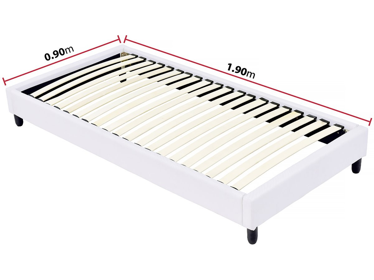Parfait pour les petits espacesCe sommier une place 90 x 190 cm est parfait pour aménager la chambre de vos enfants, la chambre d'amis ou votre studio.Pratique, il ne prend pas de place et vous permet d'aménager le reste de la chambre selon vos envies.Un sommier résistantCe sommier est équipé de 20 lattes souples en bois. Celles-ci vous permettront de soutenir efficacement votre matelas pour vous offrir une literie agréable et confortable. Fabriquées en contreplaqué, ces lattes sont résistantes et appréciées pour leur fiabilité dans le temps.Faîtes le choix de mieux dormirParce qu'il est partiellement tapissé, ce sommier a pour avantage de permettre à votre literie de respirer. Autant pour votre matelas que pour le sommier à lattes, cette aération va permettre le renouvellement de l'air à l'intérieur de votre ensemble literie, réduire les mauvaises odeurs ainsi que le développement de bactéries. Sommier tapissier - Dimensions matelas : 90 x 190 cm - 20 lattes - Structure en contreplaqué - Cadre recouvert de polyester - Pieds fournis - Blanc .Descriptif du sommier: Sommier tapissier pour matelas 90 x 190 cm