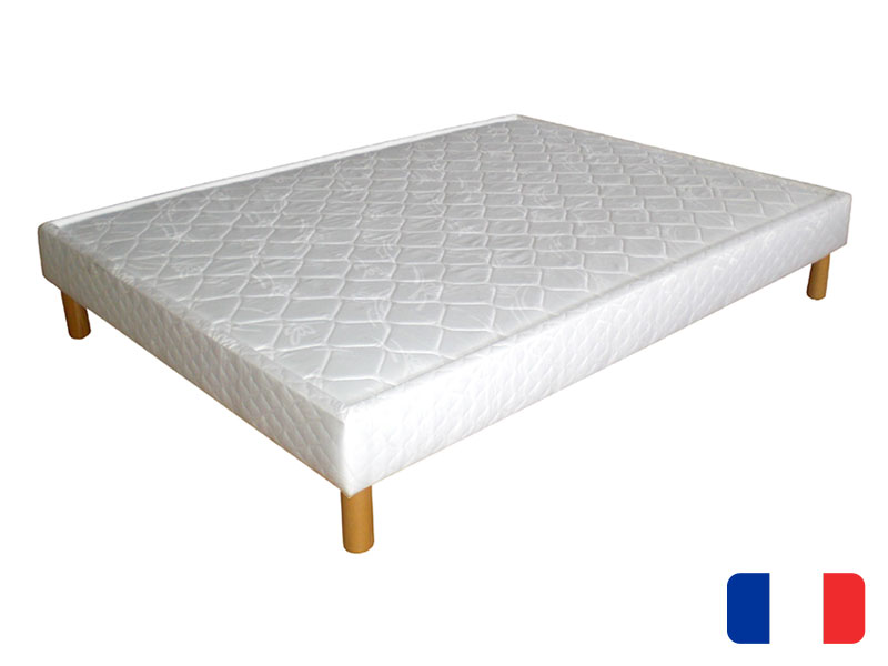 - Suspension : 299 ressorts biconiques pour la dimension 140x190.- Type de ressorts : ressorts biconiques thermostabilisés en fil 22/10ème. - Structure + 11 traverses en bois massif- Recouvert de façon tapissier finition cuvette- Garnissage : nappe de feutre 1200gr/m2 + mousse polyéther 5 mm- Tissu : 100 % polyester- Toile de fond anti poussière : oui- 4 masses d'angle pour pieds filetage 8mm.- Peut être inséré dans un lit ou mis sur pieds (vendus en accessoires) - Fabrication française- Sommier vendu sans les pieds (hauteur minimum 15cm).