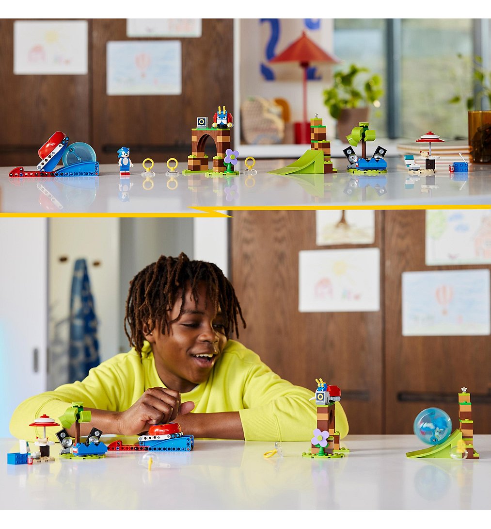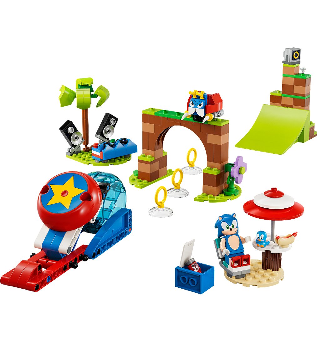 Le jeu de construction LEGO Sonic comprend une sphère de vitesse et un lanceur pour envoyer le personnage de Sonic à travers le parcours d'obstacles, où il doit vaincre le Badnik Motobug et libérer son ami Flicky. À l'aide de la catapulte, les enfants font partir Sonic pour qu'il puisse collecter des anneaux, rouler à travers le portail et remonter la rampe pour atteindre finalement l'Émeraude du Chaos. Le jouet LEGO Sonic offre non seulement beaucoup de plaisir à l'action, mais invite aussi à des jeux de rôle créatifs, car si ton enfant veut ralentir un peu, il peut jouer de manière imaginative avec les 3 figurines LEGO Sonic. Après une victoire triomphale sur le Badnik, Sonic peut en outre s'offrir un hot-dog bien-aimé et se détendre à la table du DJ.