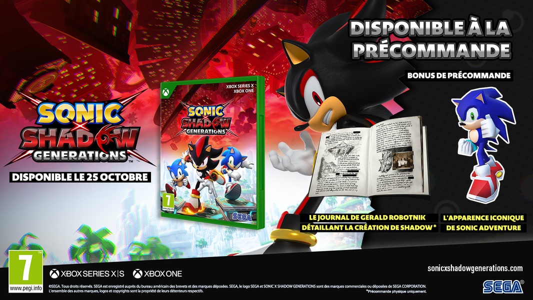 Shadow the Hedgehog revient avec Sonic classique et moderne dans SONIC X SHADOW GENERATIONS, une nouvelle collection offrant deux expériences uniques ! Incarnez Shadow dans une histoire inédite et découvrez ses nouvelles capacités attestant qu'il est le seul et unique être suprême ! Foncez à travers les niveaux marquants de l'histoire de Shadow, découvrez des secrets cachés et déverrouillez de nouveaux pouvoirs pour terrasser Black Doom et sauver le monde. SONIC X SHADOW GENERATIONS inclut également un remaster complet du célèbre SONIC GENERATIONS, une aventure à travers le temps proposant des niveaux emblématiques en 3D et 2D retravaillés avec des graphismes améliorés et du contenu bonus. Caractéristiques : - Passé et présent : Les Sonic Classique et Moderne doivent s'unir pour vaincre le Dr. Eggman et Time Eater afin de restaurer le cours du temps.