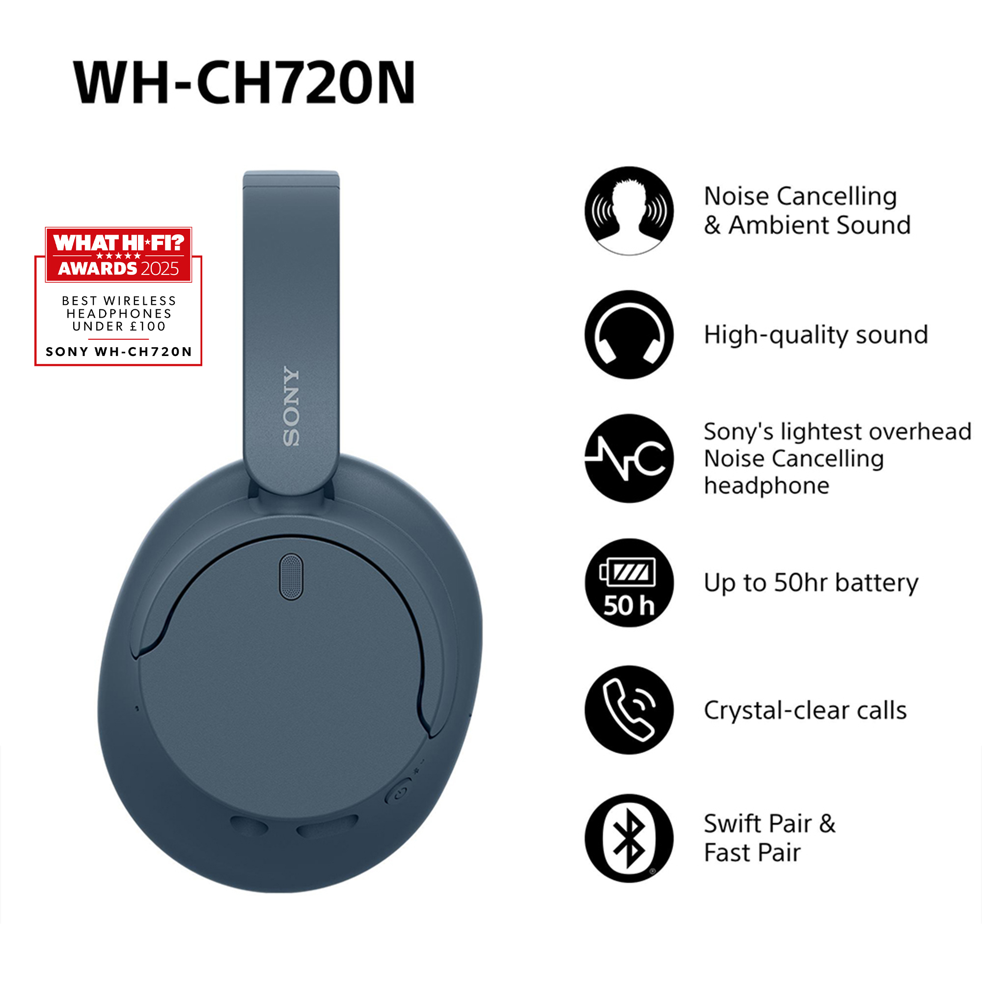 Sony WH-CH720N. Type de produit: Casque. Technologie de connectivité: Avec fil &sans fil, Bluetooth. Utilisation recommandée: Appels/Musique. Fréquence des écouteurs: 7 - 20000 Hz. Portée du routeur sans fil: 10 m. Longueur de câble: 1,2 m. Poids: 192 g. Couleur du produit: Bleu