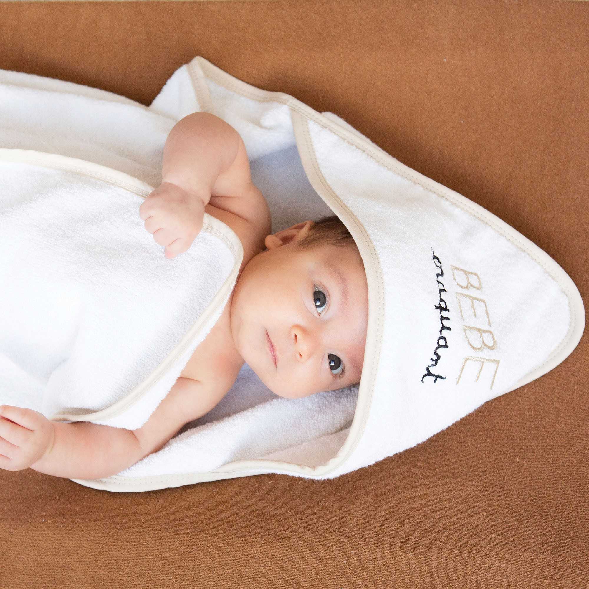 Cette sortie de bain trop mignonne est en éponge 100% coton et labelisé OEKO-TEX STANDARD 100. Le dessus de la capuche est en jersey 100% coton. Elle est très douce et absorbante. Taille 70x70