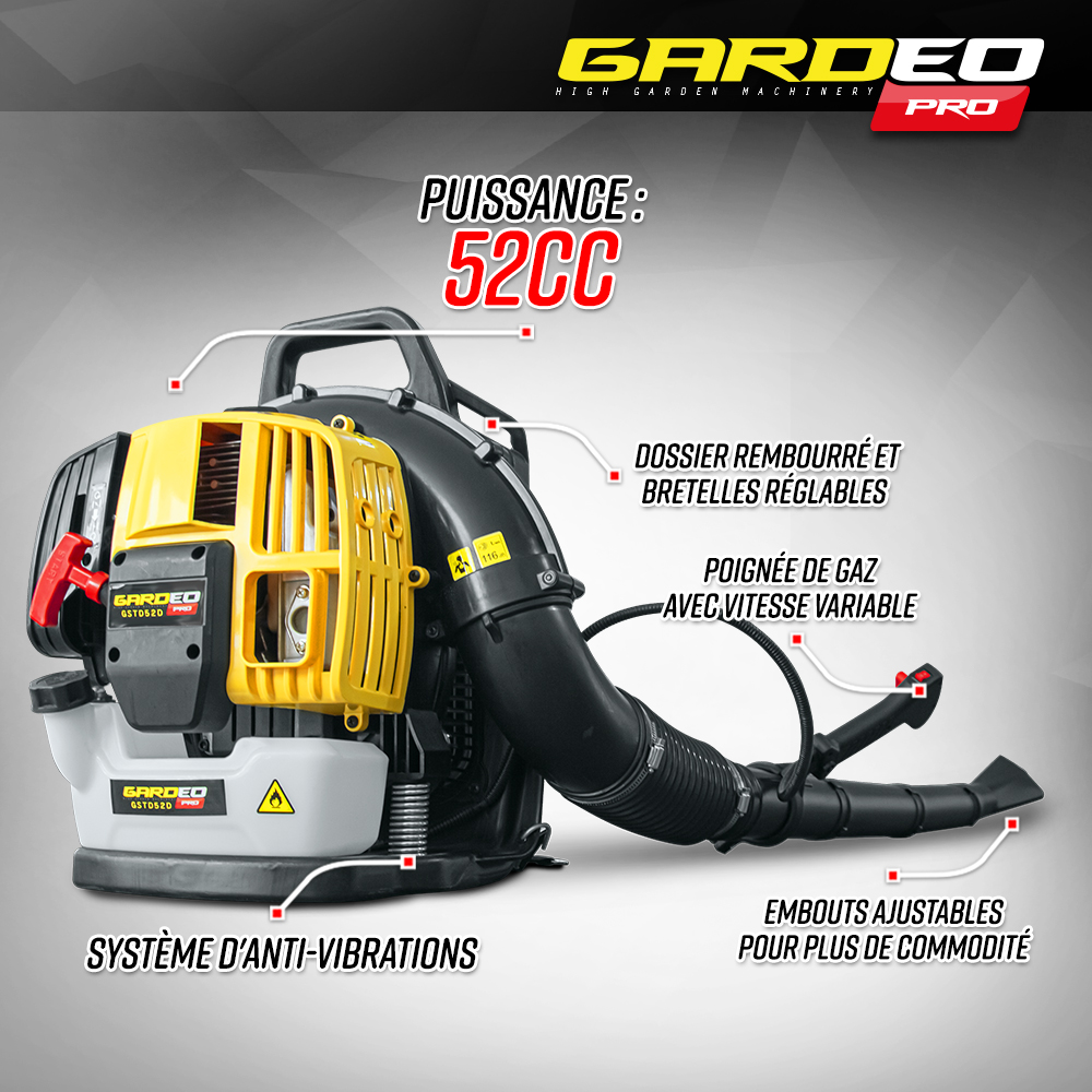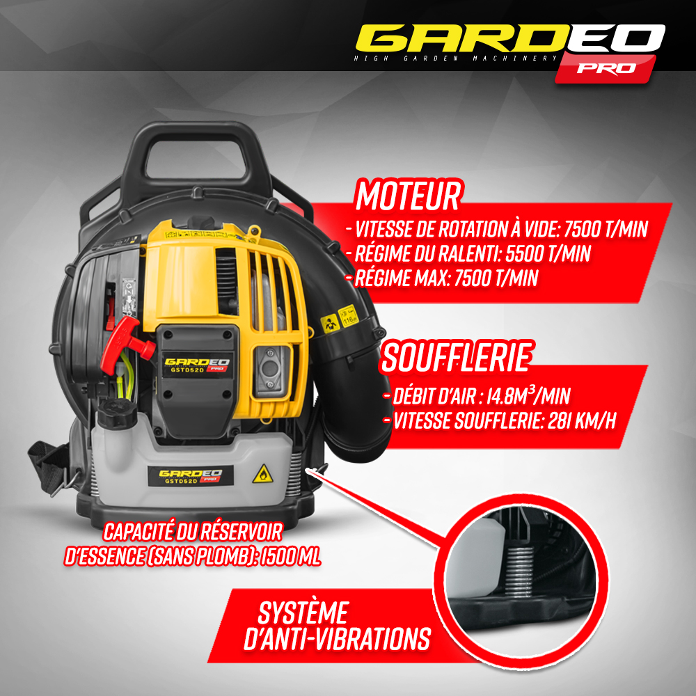 | Libellé | Souffleur thermique dorsal 52CC - 281km/H - Gardeo Pro |
