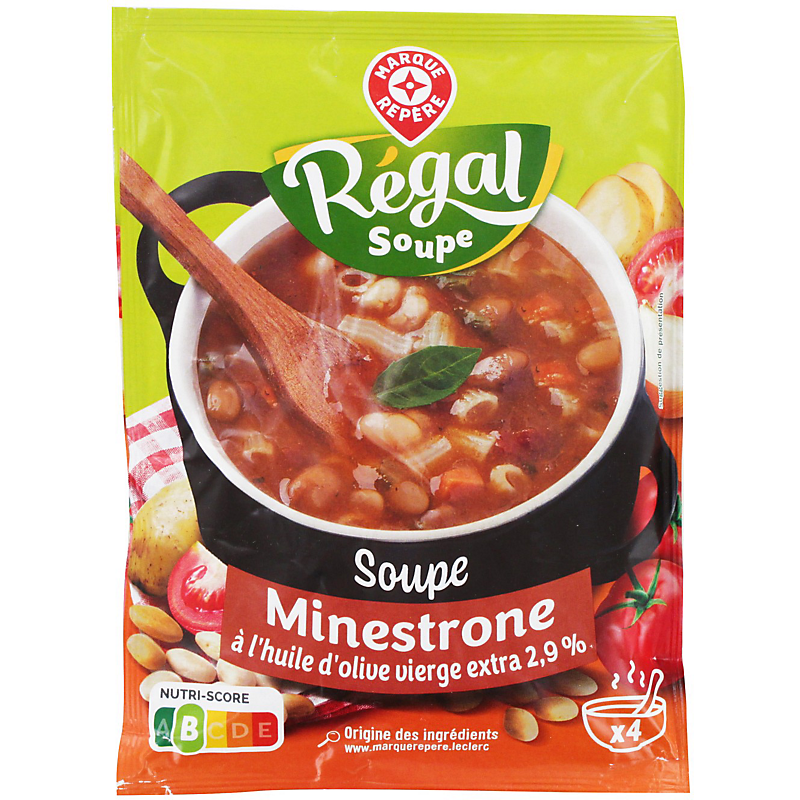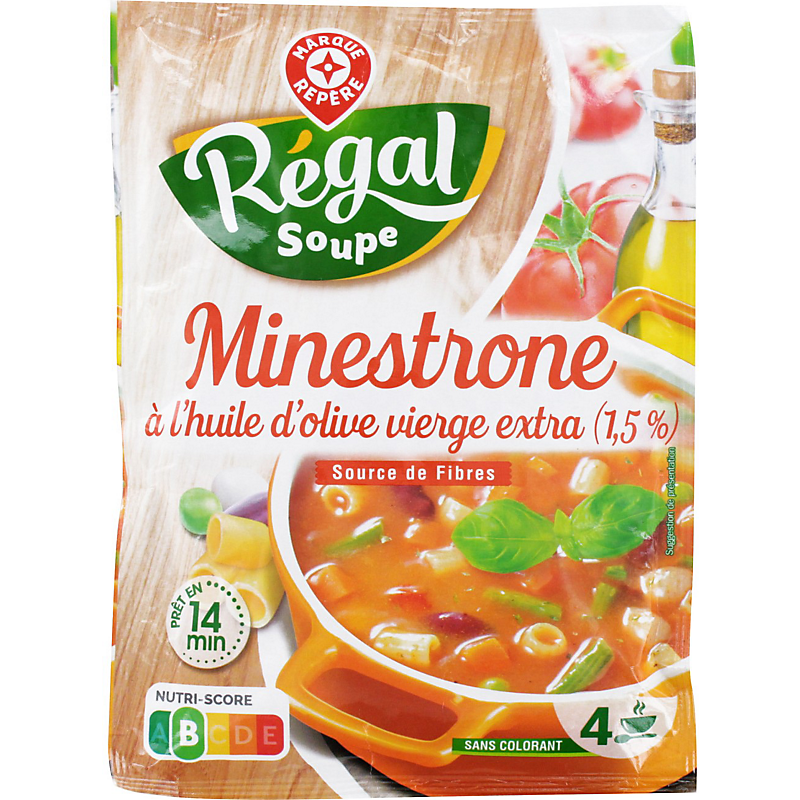 Soupe déshydratée aux légumes (45 %), aux pâtes alimentaires et à l'huile d'olive vierge extra (2,9 %) REGAL SOUPE