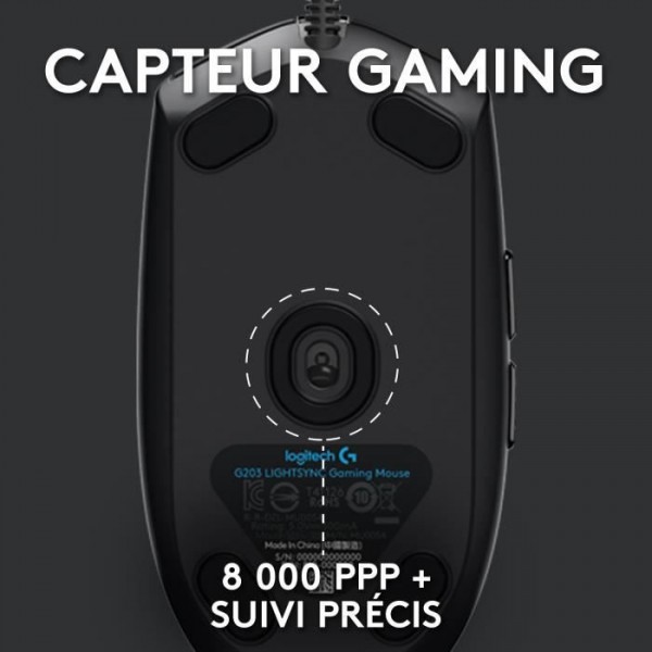 La souris G203 LIGHTSYNC est prete pour le jeu grâce a un capteur gaming de 8 000 PPP et des couleurs LIGHTSYNC RVB personnalisables. Bénéficiez des performances dont vous avez besoin pour profiter au maximum de vos jeux. Les fonctions avancées nécessitent le logiciel gaming Logitech G HUB, disponible a l'adresse logitechG.com/GHUB.