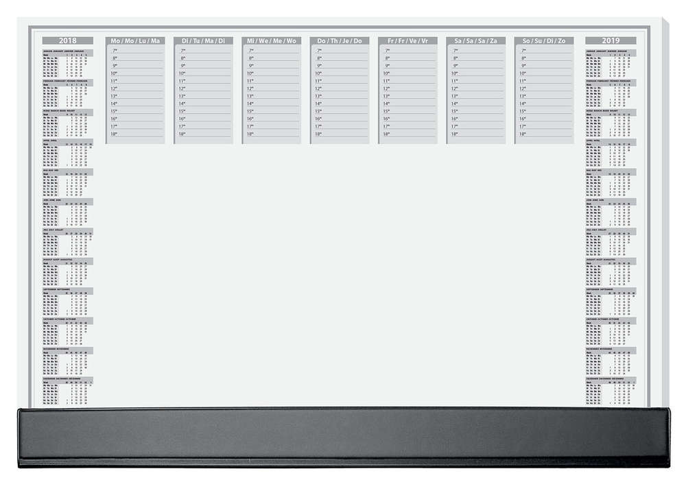 SIGEL - Sous-main bloc papier "Office" - 590 x 410 mm  . Sous-main fonctionnel Office avec barre de protection en plastique noir sur le bord inférieur. Papier de qualité supérieure (80 g/m²), 40 feuilles en format 595 x 410 mm. Avec calendrier sur 2 ans, semainier et grille horaire journalière. Quadrilingue : allemand, anglais français et néerlandais. Les coins ne se plient pas grâce au solide encollage en pied et partiellement en tête de page. Dos en carton solide pour une parfaite planéité..